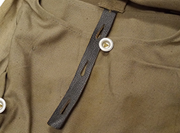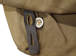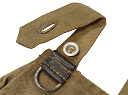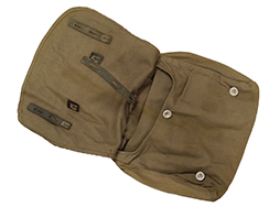 本体生地はカーキ色のコットン製で、やや日焼けが見られます。 生地には保管の際についた若干の皺や僅かな解れ等が見られるものの、大きな破れ等は見られません。 蓋の裏側にはDRKのスタンプが押印されています。 蓋を留める両サイドのベルトはやや硬くなっていますが、雑嚢の内容物を押さえるセンター・ベルトは比較的柔らかさを保っています。 布生地と革ベルトの接触する面には、ベルトによる色移りが若干見受けられます。 その他の蓋外側の革製バンドやDリングの留革には大きな破損は見られず、しっかりとした状態が保たれています。 Dリングやベルト・フックは鉄製となっており、僅かな表面錆等が見られるのみで大きな腐食はありません。 全体的に大きな破損も無く、概ね良好な程度が保たれています。 (TK)- 詳細画像