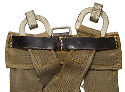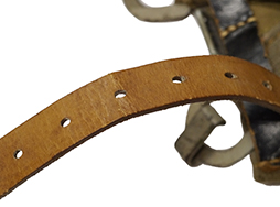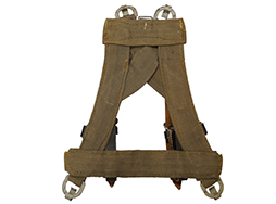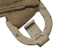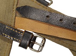 - アイテム説明ドイツ軍 Aフレームです。 ウェスト・ベルト及びYサスペンダーと併用することで、飯盒やツェルト・バーン、丸めたコートや毛布を背負子式に装着することが出来ます。 尚、本品には飯盒固定用のストラップは付属しません。 布製のフレーム本体にはスタンプが押されていますが、掠れており判読は難しくなっています。 フレームにはやや縫い糸の解れや擦れが見られるものの、大きな破れや破損は見られません。 フレームにリベット留めされたツェルトバーン用ストラップにはやや硬化が見られ、ヒビ割れが発生しています。 現状では破断に至っていませんが、やや取り扱いに注意が必要です。 各フックには塗装の剥がれが見られるものの、こちらも大きな変形や破損は見受けられません。 下部のフックには「菱形内にPC」のマークが打刻されています。 (TK)