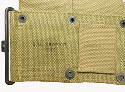 表面の「U.S」のスタンプは他のカードリッジ・ベルトとフォントが異なり、後から書かれたものと思われます。裏面には製造メーカーとされる「D,M SHOE CO」と製造年の「1942」のスタンプがあり、比較的良好な可読性が保たれています。