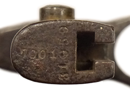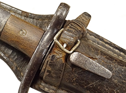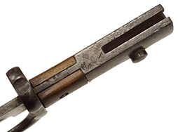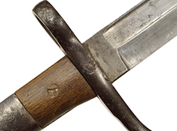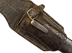 銃剣本体には全体に経年に伴う時代錆見られますが、状態は落ち着いており大きな腐食の発生は見られません。 白磨きの刀身は小傷こそ見られますが、大きな錆もなく程度は良好です。 鍔周辺にはやや打ち傷が散見されますが、菊花紋章はしっかりと残っています。 柄頭には31959と7001(0)のシリアルNo.が打たれています。 柄木(グリップ・パネル)は交換されているようですが、木部に時代がついており大きな違和感はありません。 本来、柄木はカシメ留めですが、マイナス螺子に交換されています。 右面柄木の固定にややガタつきが見られます。 固着していることの多い着剣装置のボタンもしっかりと可動し、テンションも健在です。 金属製の鞘には朽ち込みや時代錆が散見されますが、現状で状態は落ち着いています。 鞘裏面の下部には浅い凹みが1箇所見られます。 鞘内部の押さえバネもやや弱くなっているものの効いており、納刀時にしっかり銃剣が保持されます。 革製の剣差は時代相応のひび割れや乾燥などの経年感が見られます。 欠損していることが多い鞘の差金を引っ掛けるベルトやバックルも残っており、約130年前の革製品としてはかなり良好な状態が保たれています。 ベルト部分は現状千切れ掛かっているため取り扱いに注意が必要ですが、遊革(キーパー)にも欠損はありません。 帯革通し(ベルト・ループ)の内側には補強の革が張られています。 革部分には全体的に細かなひび割れや折れなどが見られるためやや取り扱いには注意が必要ですが、総じてシルエットは完全です。 (TK)- 詳細画像