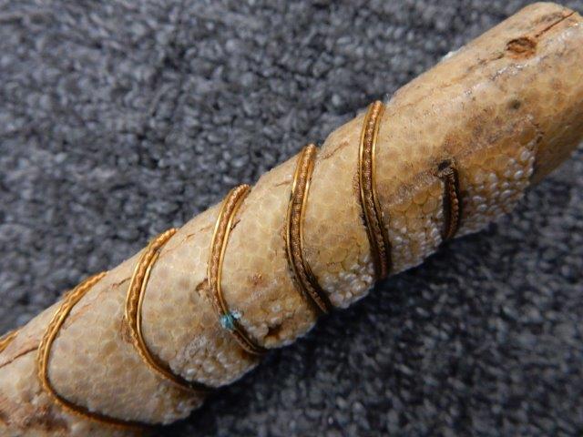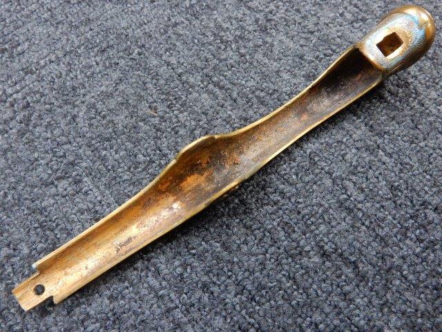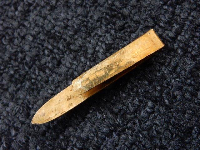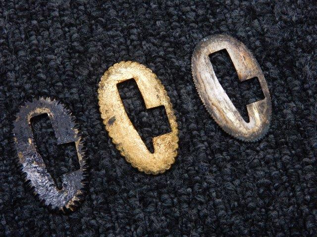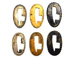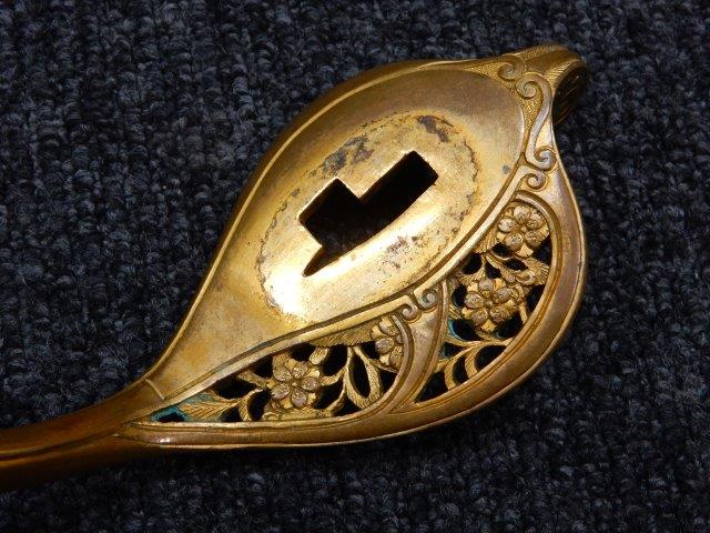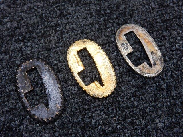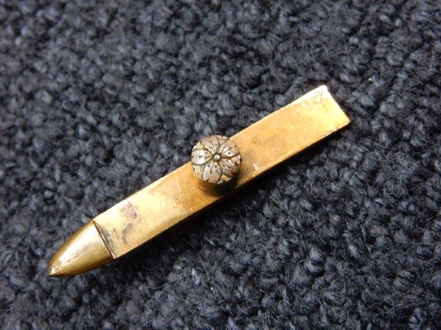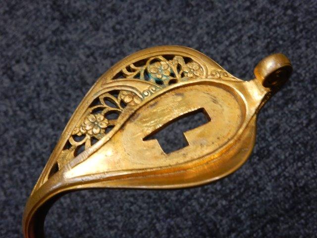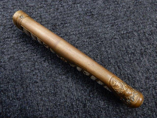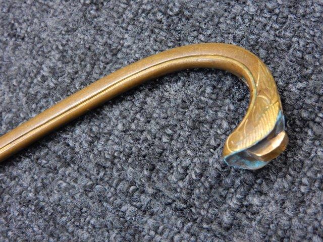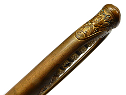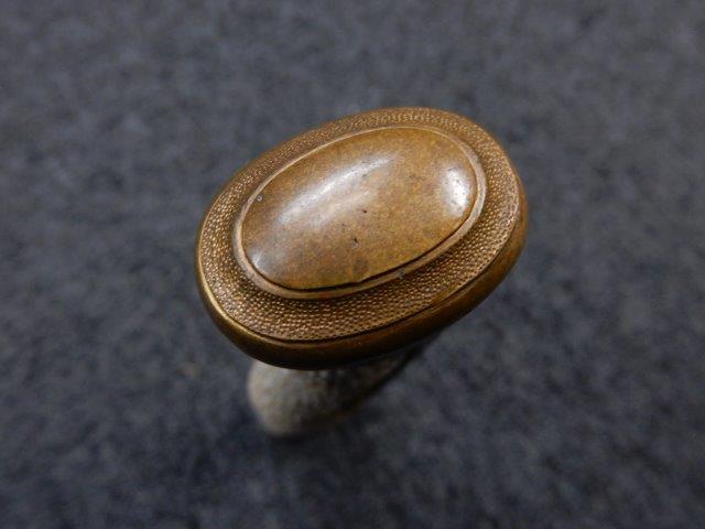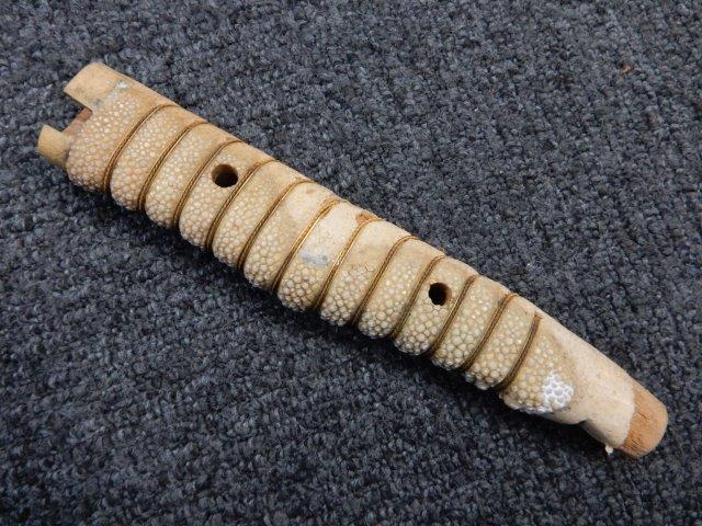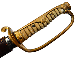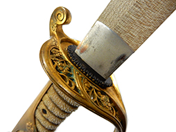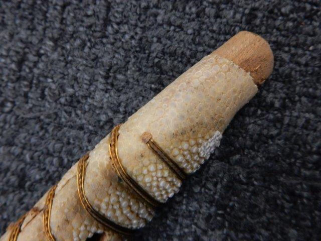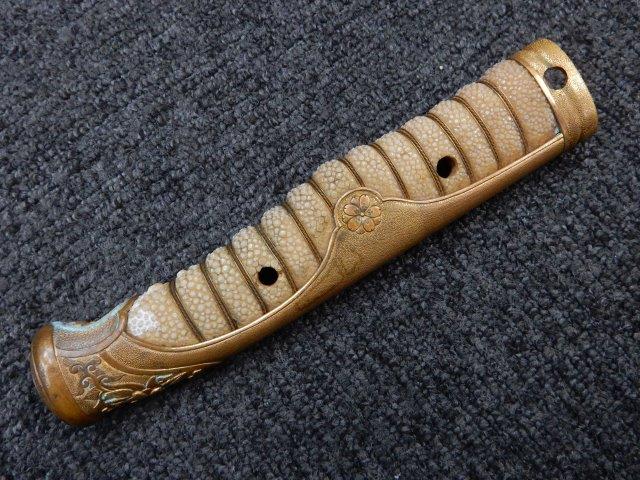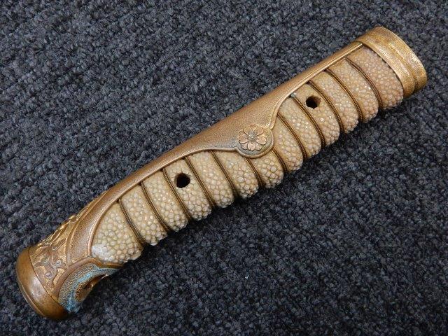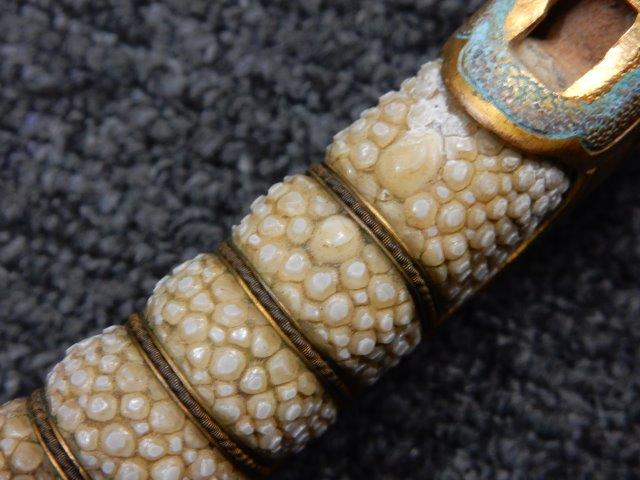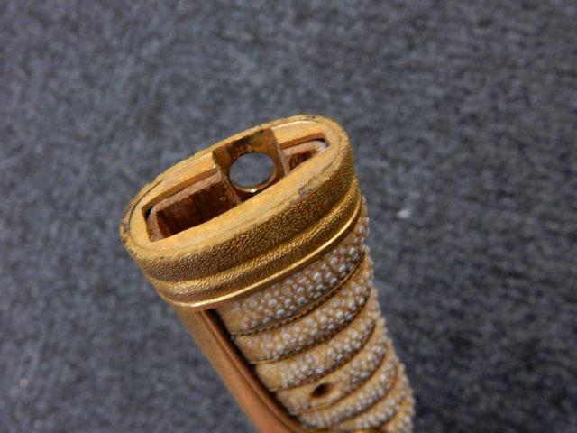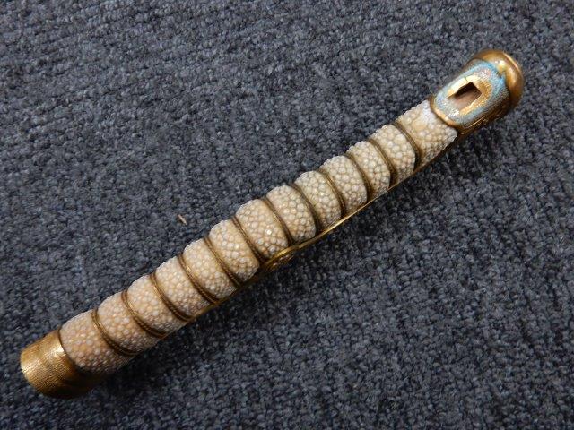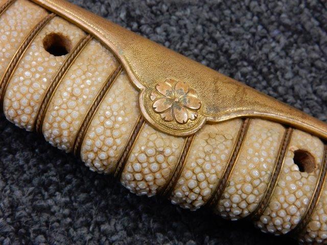 両手握用の柄は本白鮫を使用し、親鮫付の品が使用されています。 三重金線(太1本、細2本)は緩みも見られず良好な状態です。 護拳には尉官用の背金終端の彫りが施されています、全体に経年感は見られますがこちらも良好な状態です。 駐爪の発条(バネ)も効いてしっかりと掛かり作動もスムーズです、切羽は揃い6枚(無刻印)となっていて目釘は2か所となっています。ハバキは銅に白金系の鍍金が施されたものが装着されています。