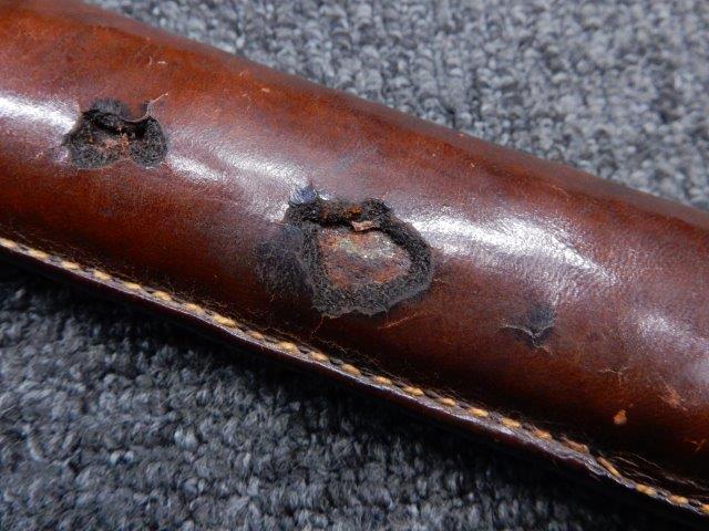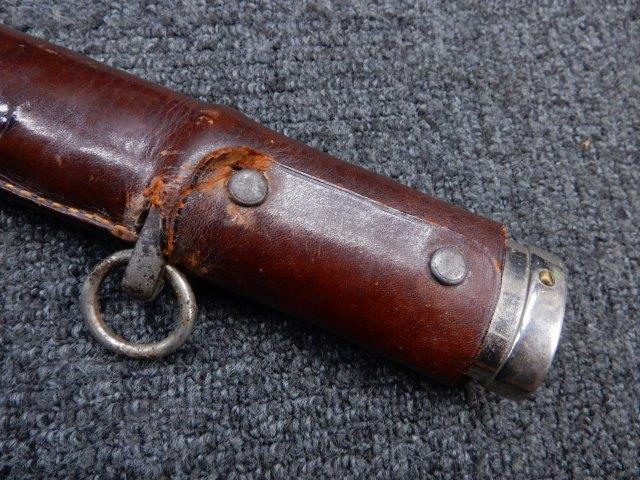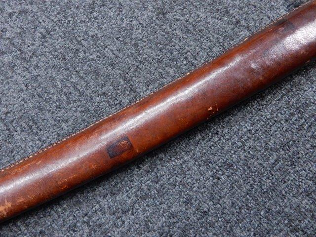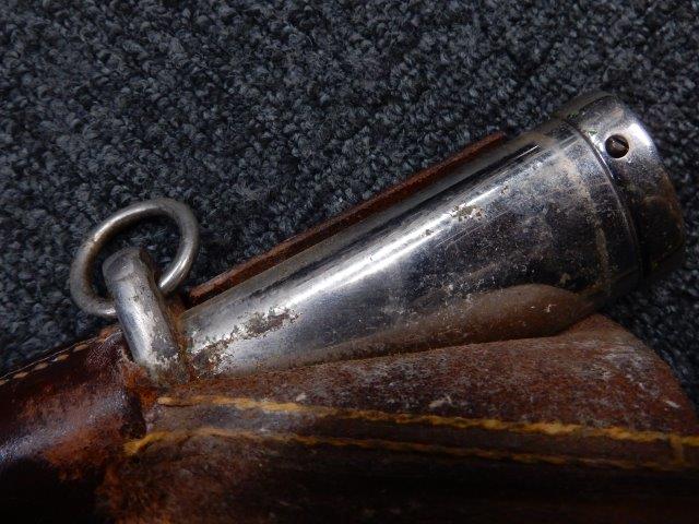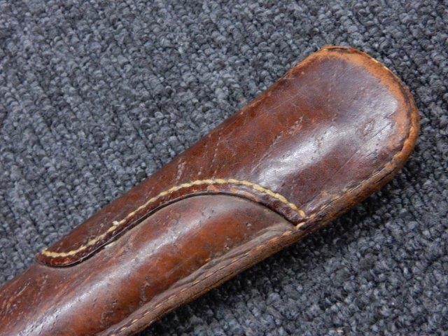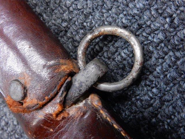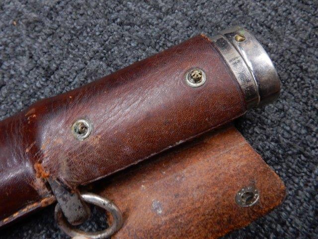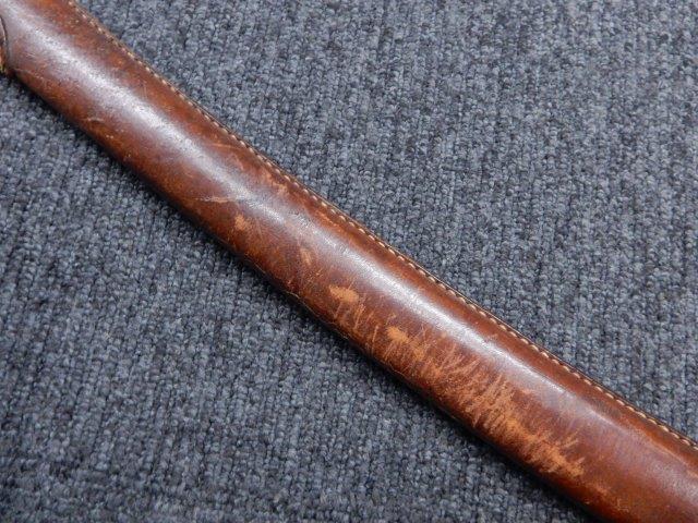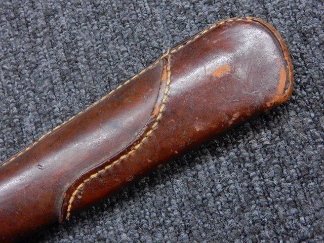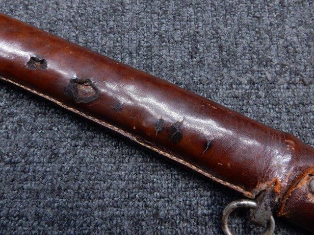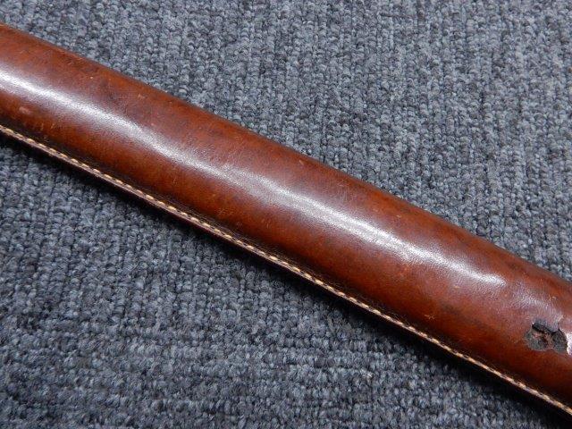 鉄製鞘には柔軟さを保った革覆いが付いています、革覆いには擦れや一部に小穴が見られますが他に大きな破損等は見受けられません。 革覆いを外すことが出来ないため中身は確認しておいませんが、錆が発生している箇所が散見されます。 しかし凹み等は見られず、経年を鑑みれば十分許容範囲内と思われます。 佩鐶はしっかりしておりガタつきなどはありません。