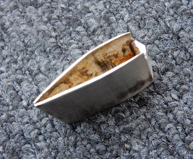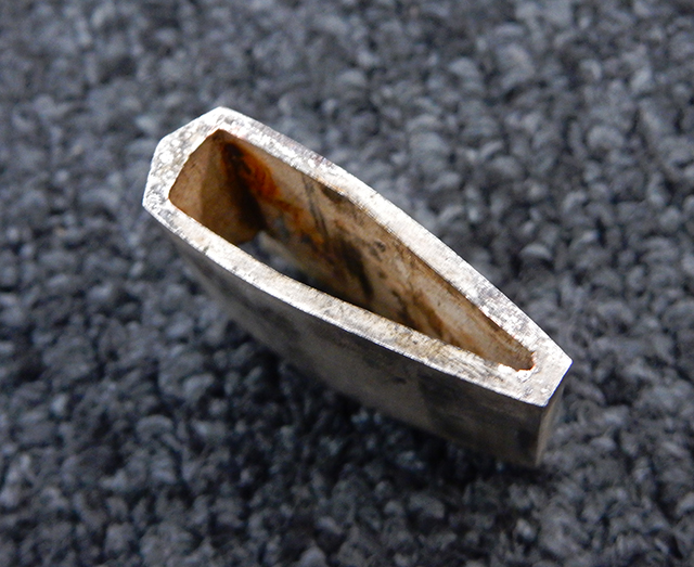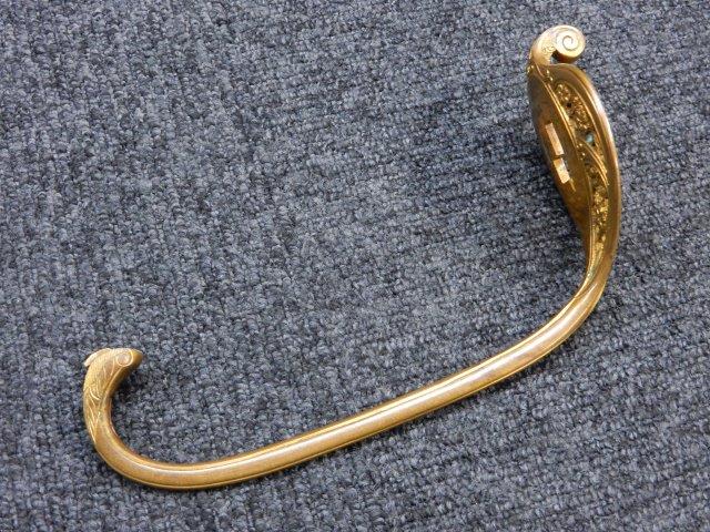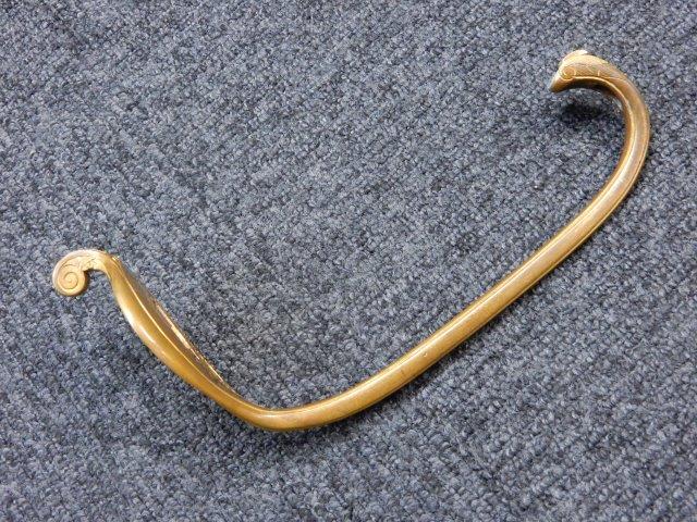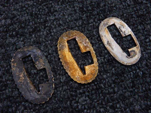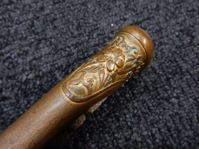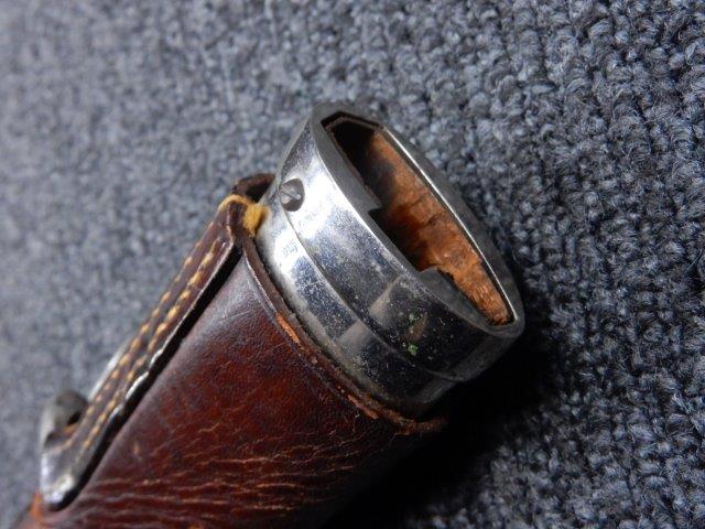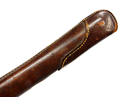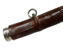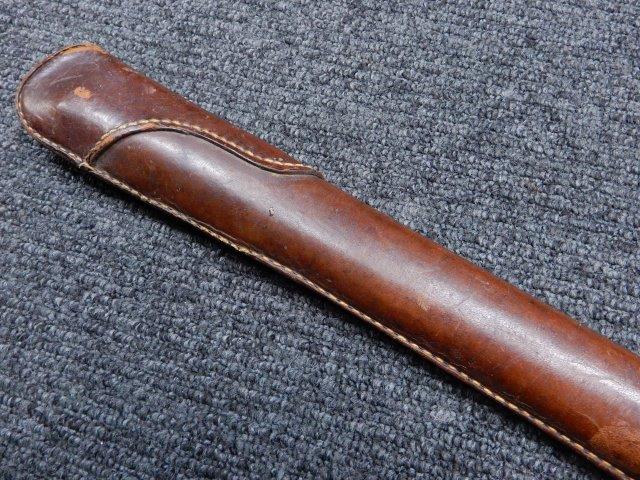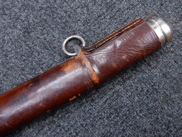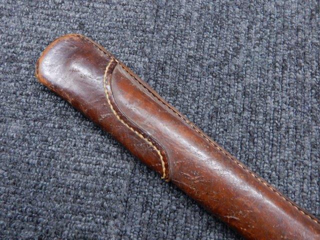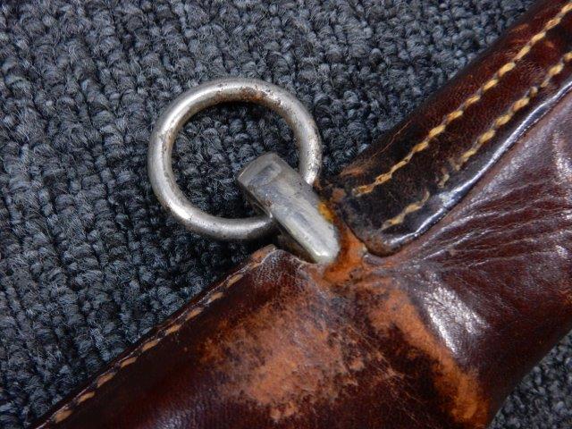鉄製鞘には柔軟さを保った革覆いが付いています、革覆いには擦れや一部に小穴が見られますが他に大きな破損等は見受けられません。 革覆いを外すことが出来ないため中身は確認しておいませんが、錆が発生している箇所が散見されます。 しかし凹み等は見られず、経年を鑑みれば十分許容範囲内と思われます。 佩鐶はしっかりしておりガタつきなどはありません。