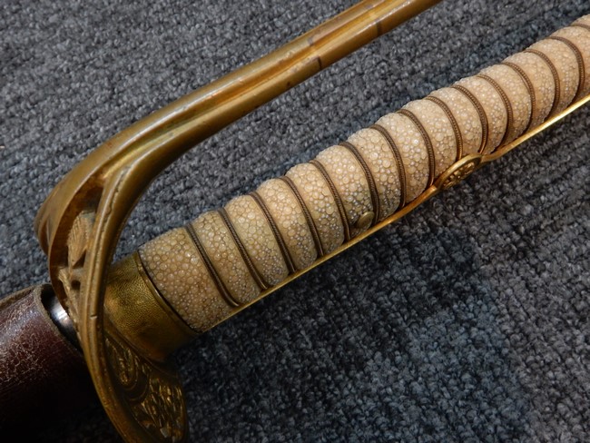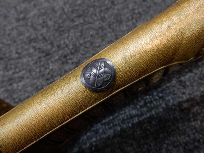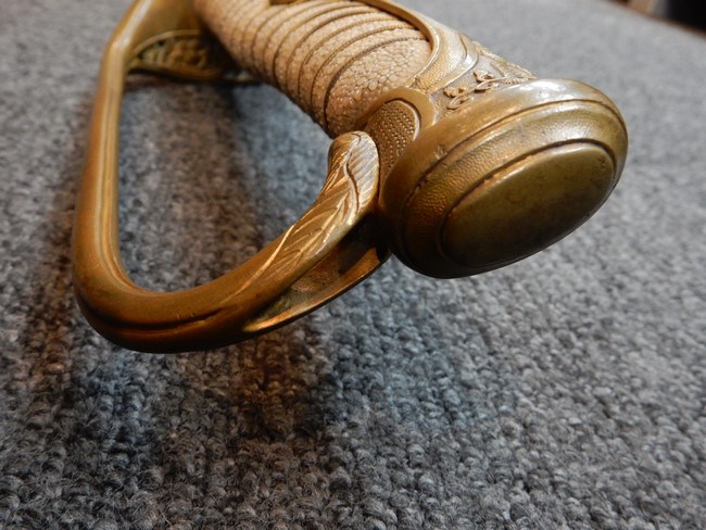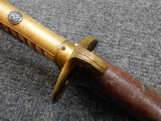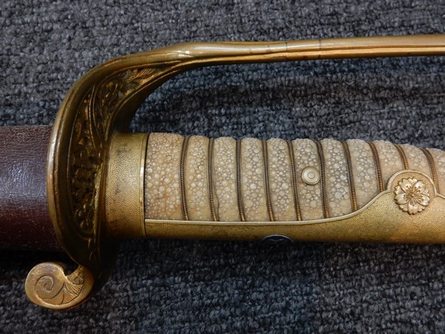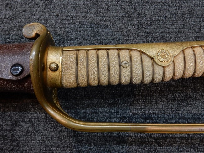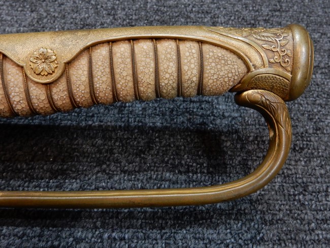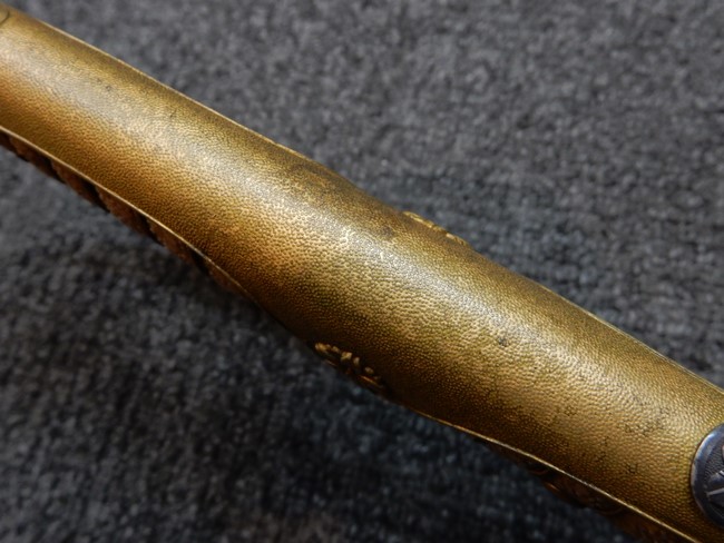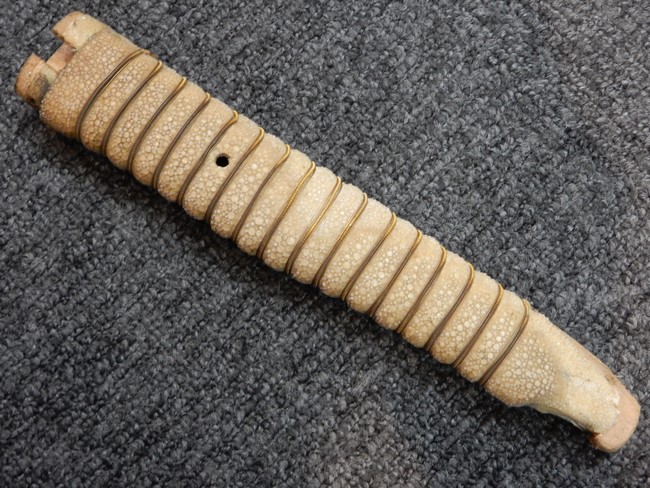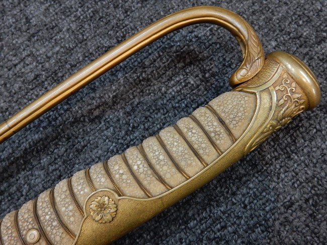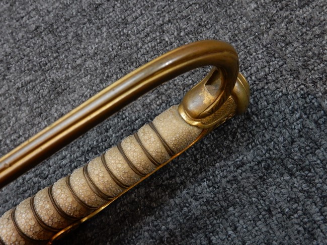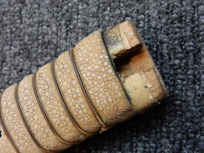 両手握用の柄は本白鮫を使用しています。 三重金線(太1本、細2本)は一部緩みも見られますが全体に良好な状態です。 背金終端には尉官用の彫りが施され前方には「違い鷹の羽(ちがい-たかのは)紋」も入っています、経年感は見られますがこちらも全体に良好な状態です。 駐爪の発条(バネ)も効いてしっかりと掛かり作動もスムーズです、切羽は3枚(無刻印)となっていて螺子式の目釘は一か所となっています。