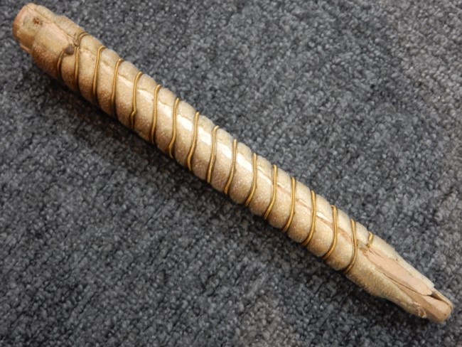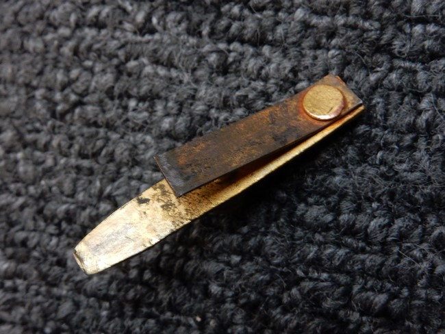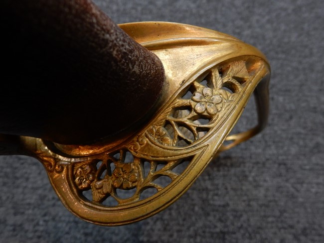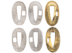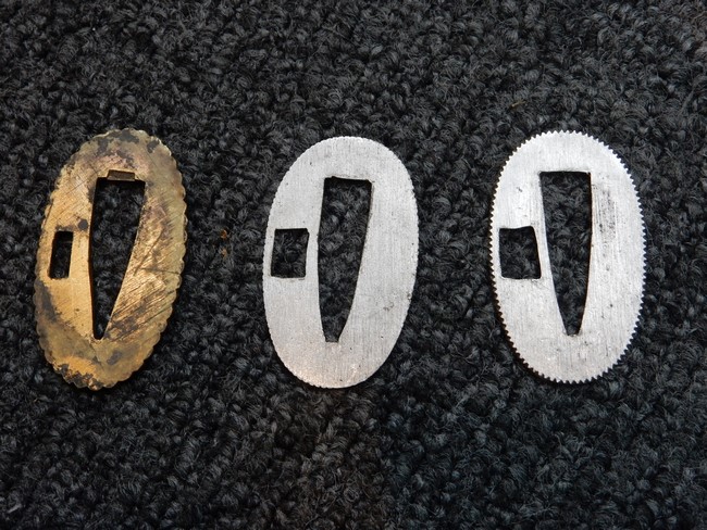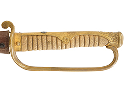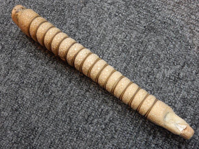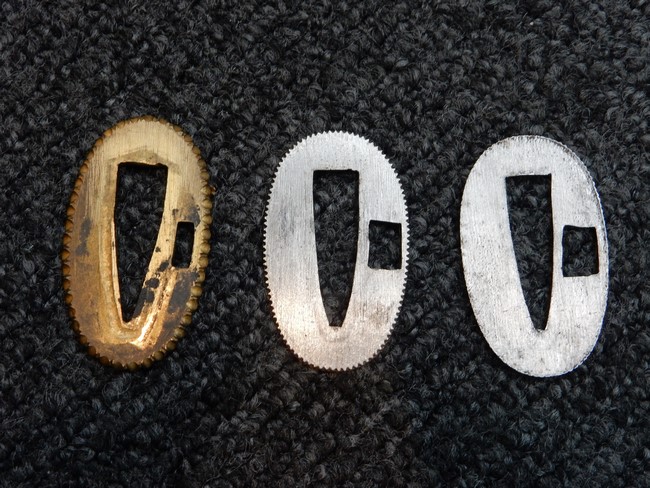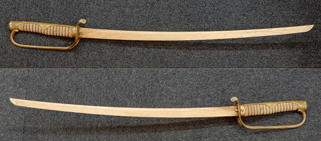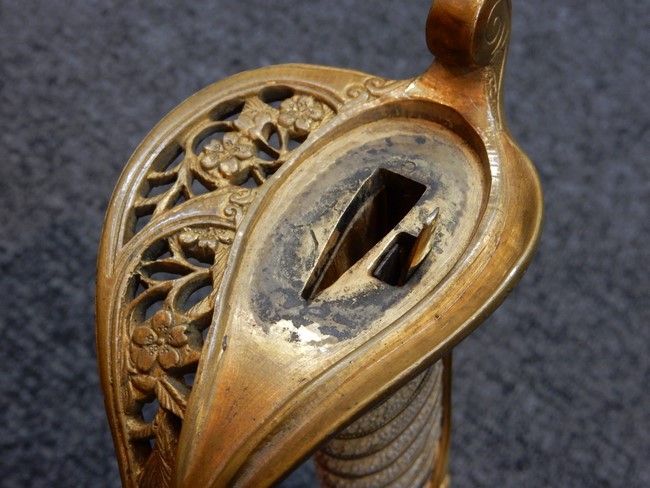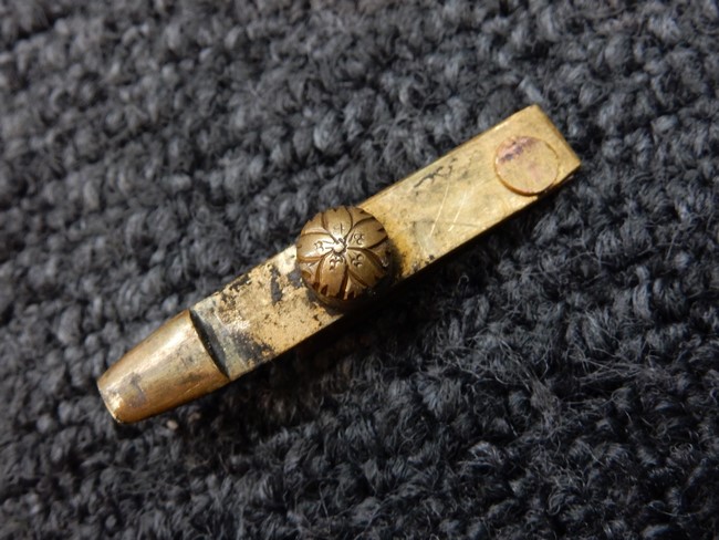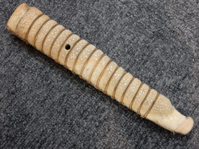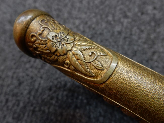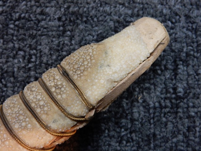 両手握用の柄は本白鮫を使用しています。 三重金線(太1本、細2本)は一部緩みも見られますが全体に良好な状態です。 背金終端には尉官用の彫りが施され前方には「違い鷹の羽(ちがい-たかのは)紋」も入っています、経年感は見られますがこちらも全体に良好な状態です。 駐爪の発条(バネ)も効いてしっかりと掛かり作動もスムーズです、切羽は3枚(無刻印)となっていて螺子式の目釘は一か所となっています。