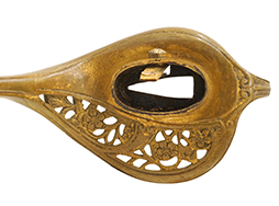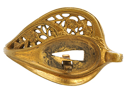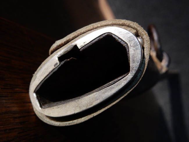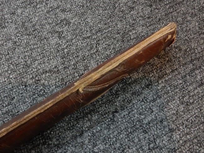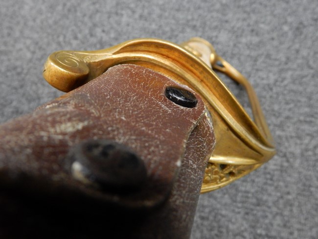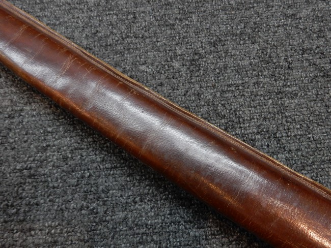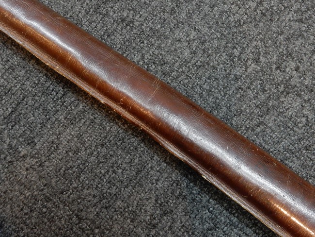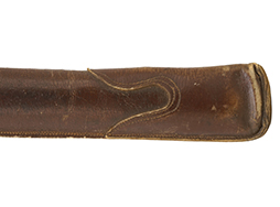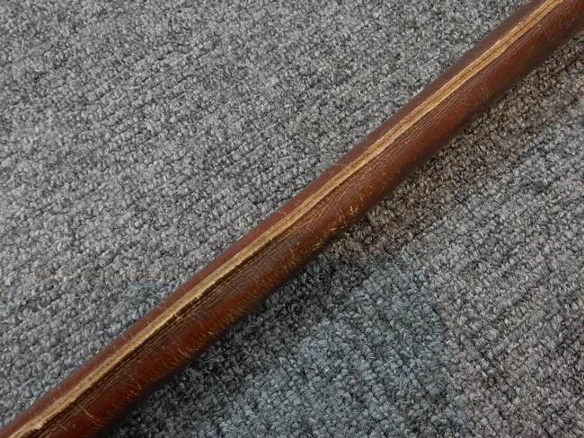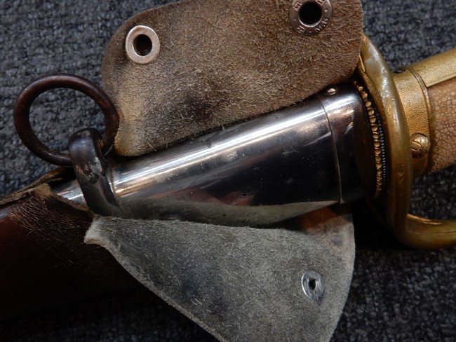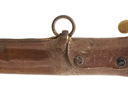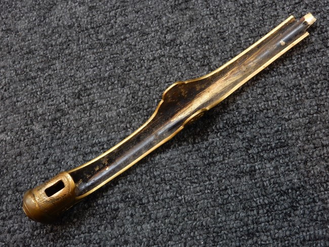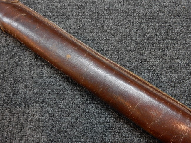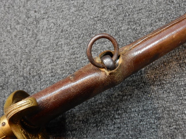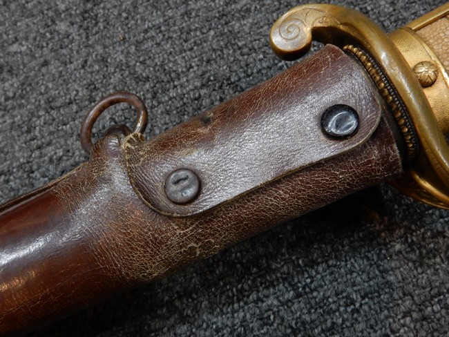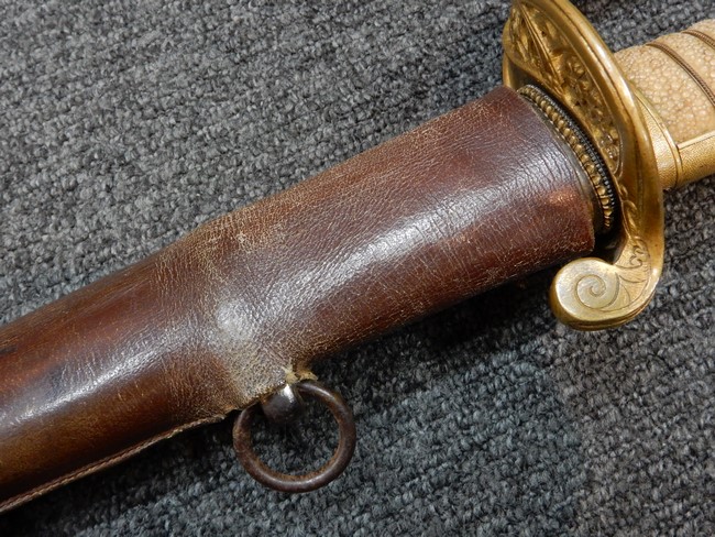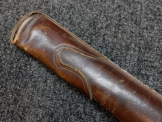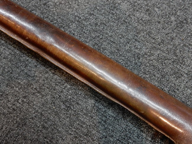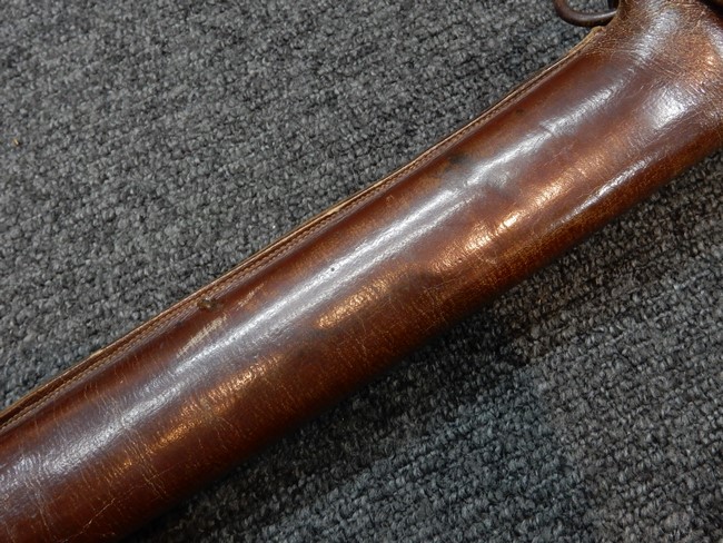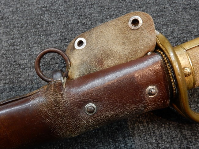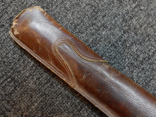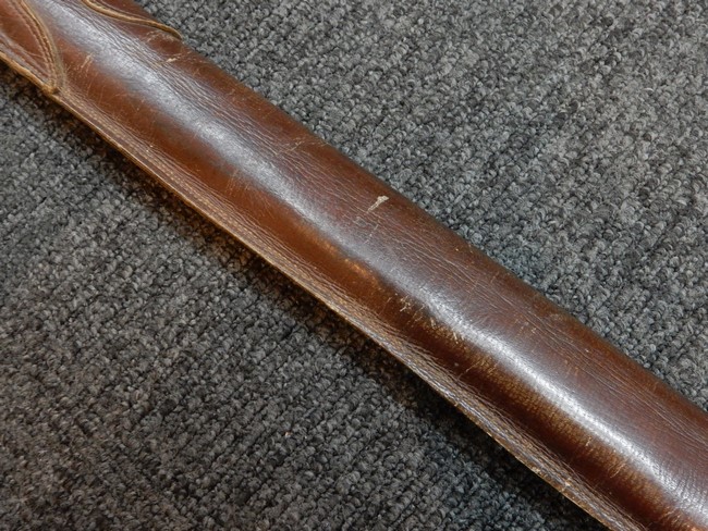 鉄製鞘には十分な柔軟さを保った革覆いが付いています、革覆いには擦れなどが見られますが他に大きな破損等は見受けられません。 石突部分が干渉して革覆いを外すことが出来ないため中身全体は確認しておりませんが、見える箇所に若干の錆が散見されます。 しかし凹み等は見られず、経年を鑑みれば十分良好な状態と思われます。 佩鐶はしっかりしておりガタつきなどはありません。