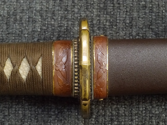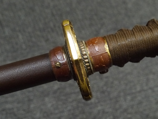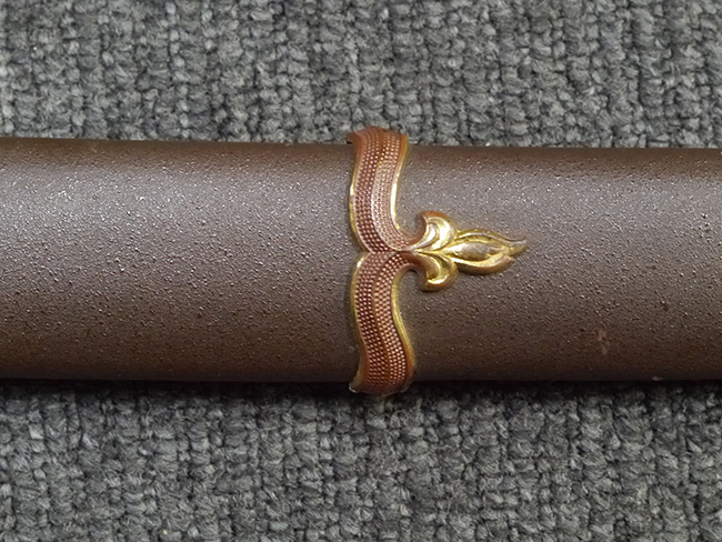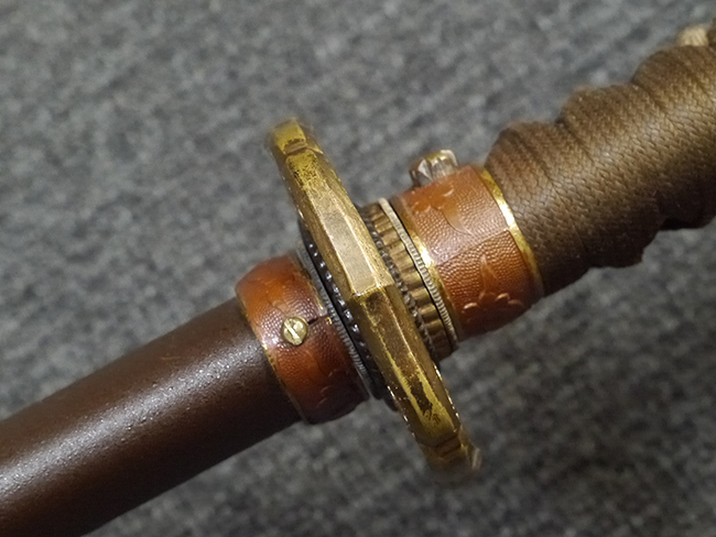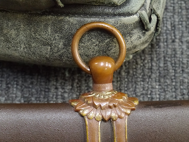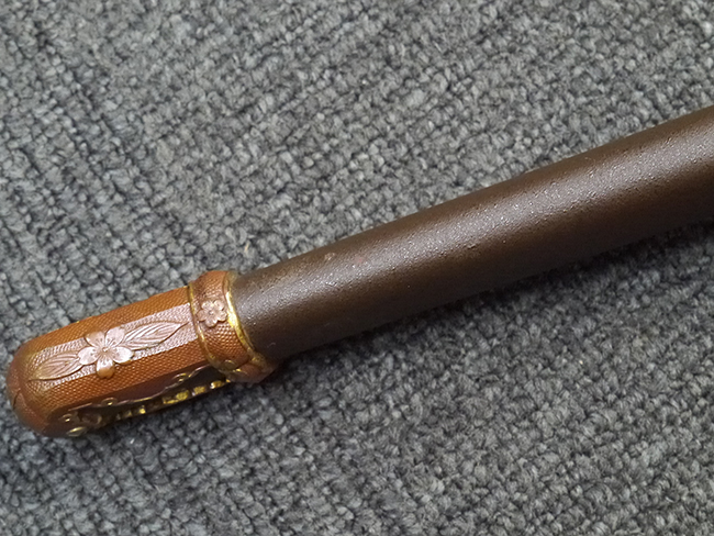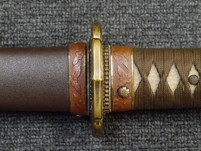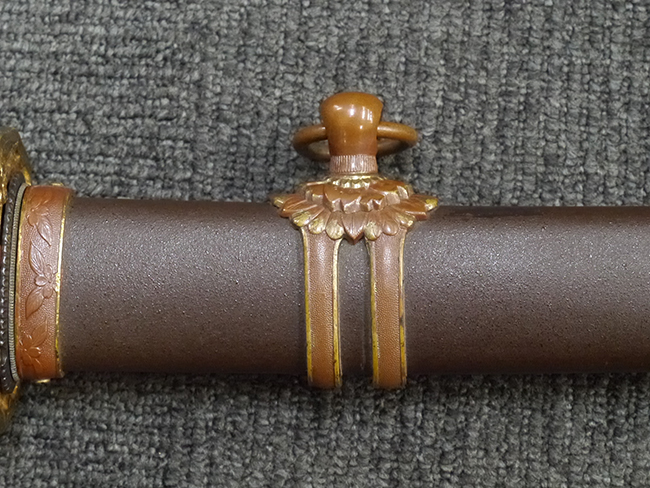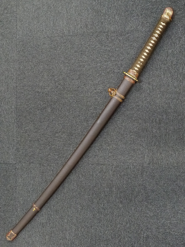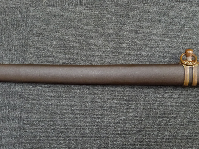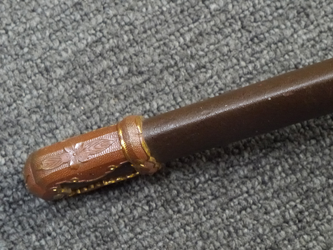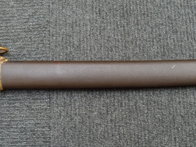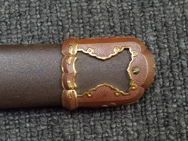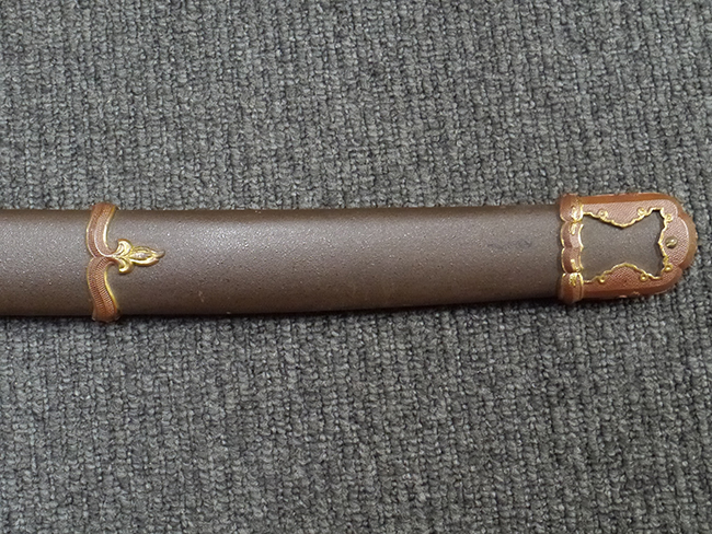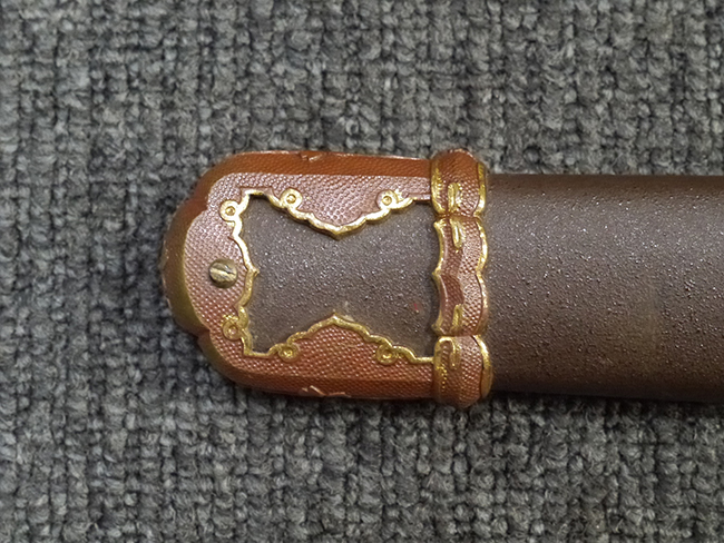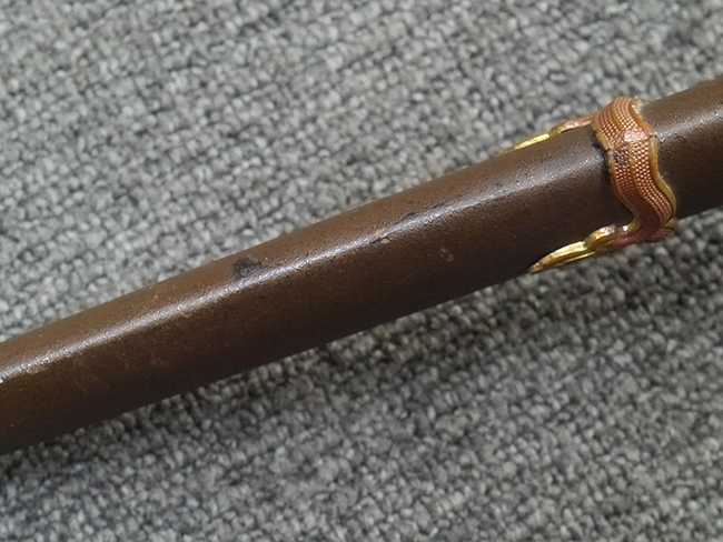 鉄製鞘は艶消しの石目塗装で「茶褐国防色」の仕上げとなっています、僅かな傷が見受けられ、一部に塗装の剥がれが見られますが、美しい外観は損なわれてはおりません。 外装金物には極僅かな使用感はありますが山吹色塗装も良く残っています。 鉄製鞘で大振な外装ですので存在感のある見栄えする拵えです。