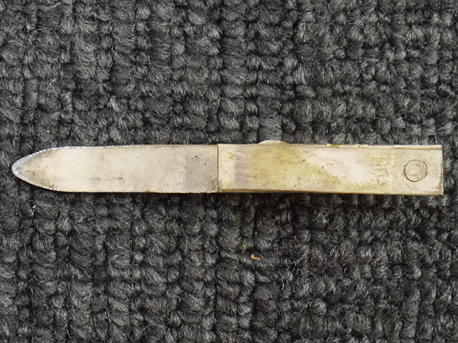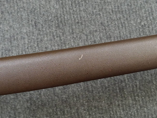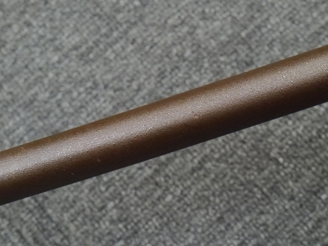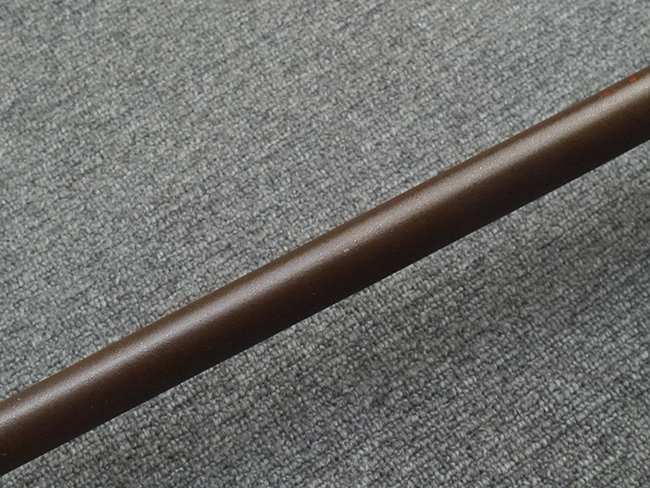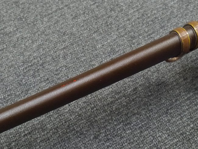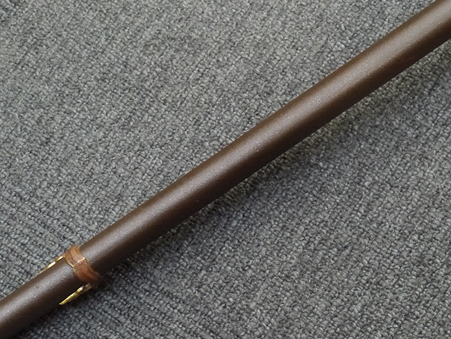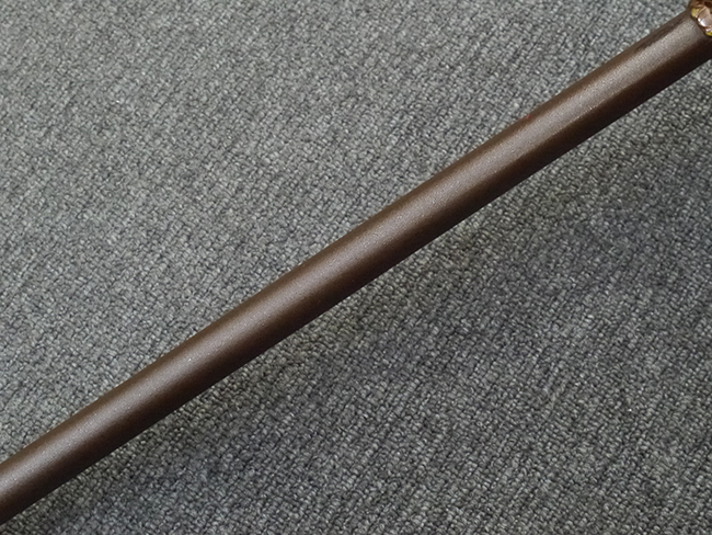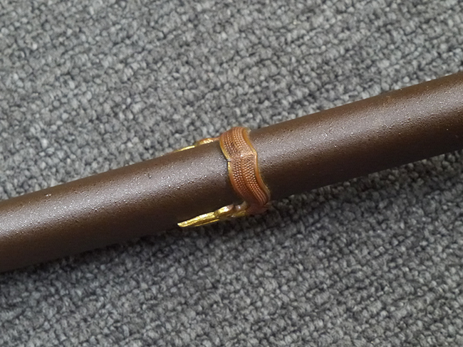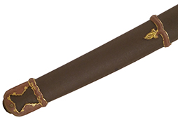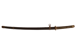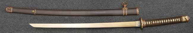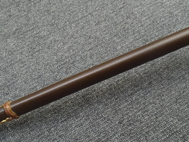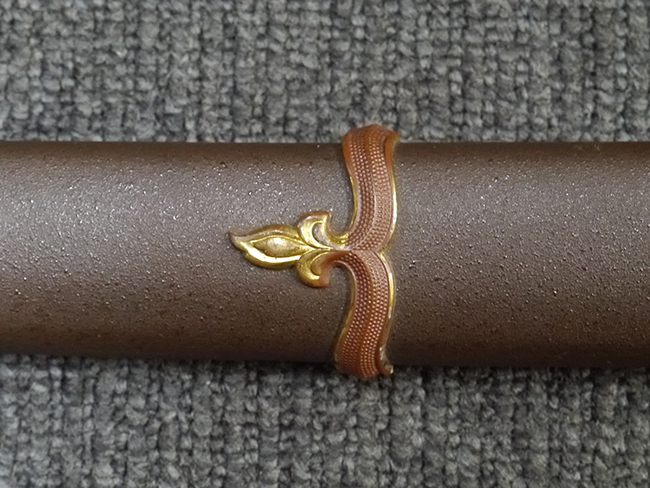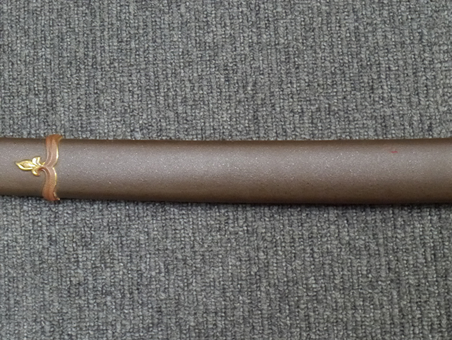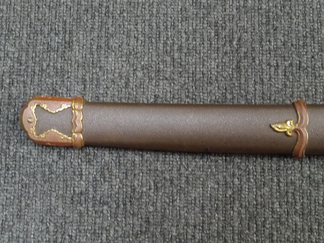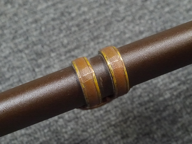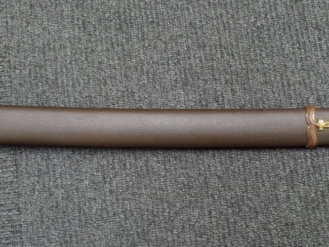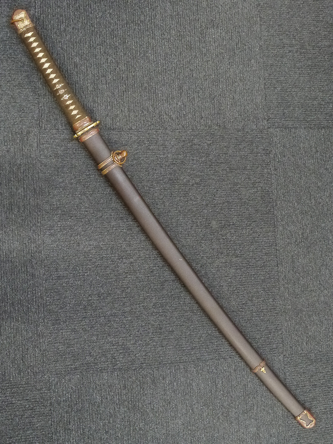 鉄製鞘は艶消しの石目塗装で「茶褐国防色」の仕上げとなっています、僅かな傷が見受けられ、一部に塗装の剥がれが見られますが、美しい外観は損なわれてはおりません。 外装金物には極僅かな使用感はありますが山吹色塗装も良く残っています。 鉄製鞘で大振な外装ですので存在感のある見栄えする拵えです。
