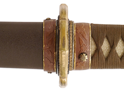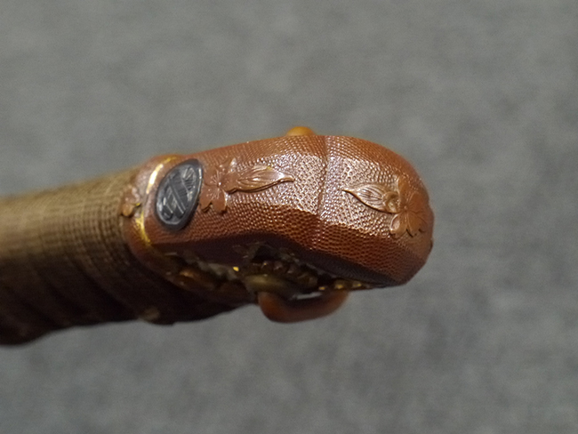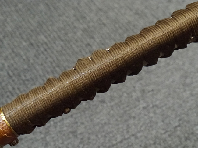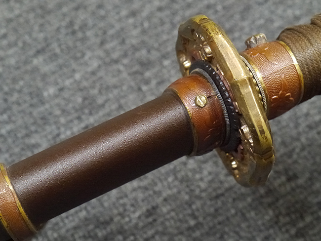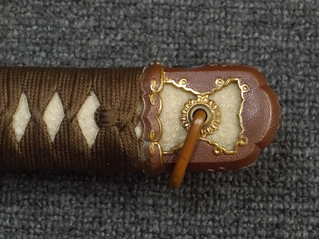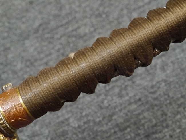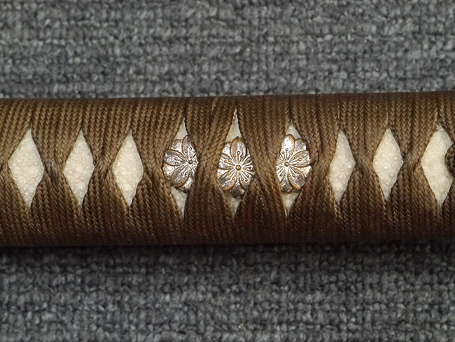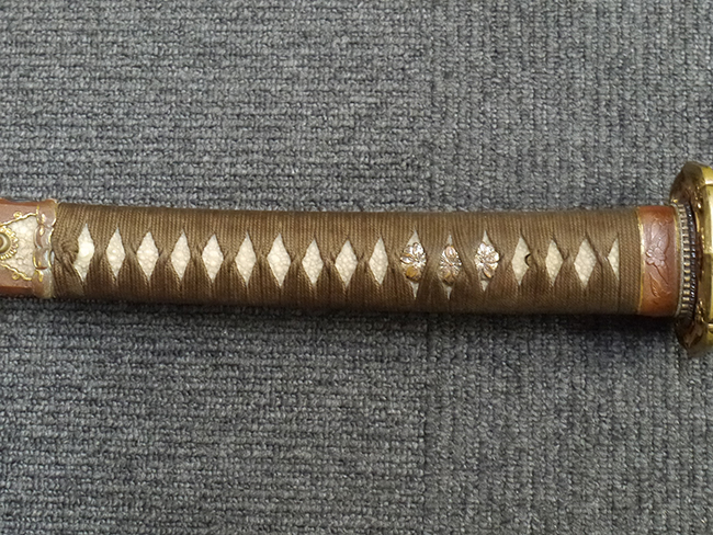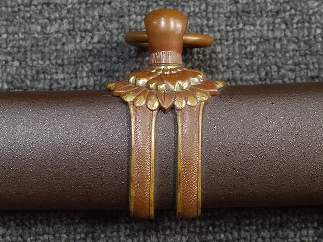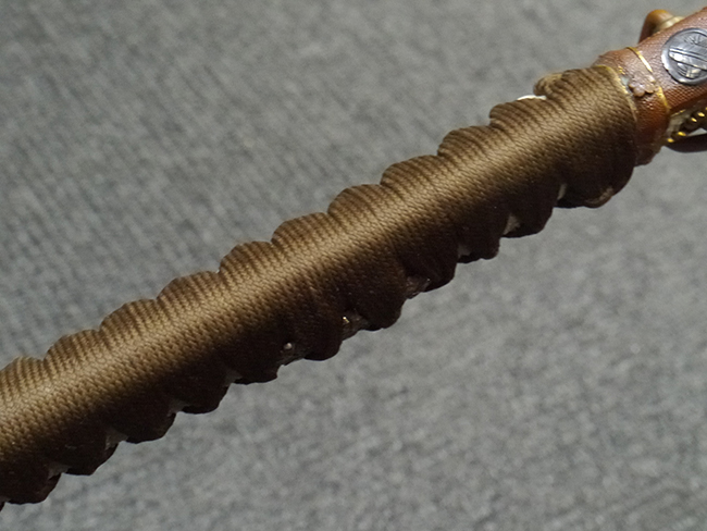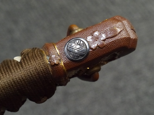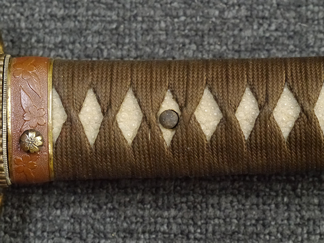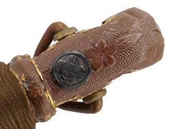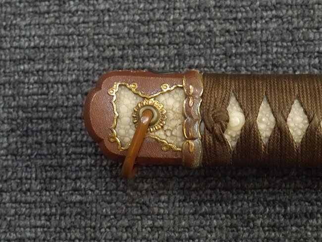 比較的長寸の刀身が入っていたと思われる柄、鞘ともに長い拵えです。 鍔は透かしの無い型打鍔となっており、切羽は7枚となっています。 鍔に切羽、柄と駐爪、そして縁に「21」と揃いの打刻がされた品です。 猿手は桜花葉模様のないプレーンな金属猿手です。 駐爪は発条(バネ)の状態も問題はありませんが、つなぎとの相性のせいか抜刀時に若干の固さが見られます。 兜金に丸に違い鷹の羽の家紋の入った柄は、親粒も見られる本白鮫で柄巻には経年による若干の使用感が見られるものの全体に良好な状態です。