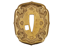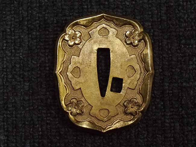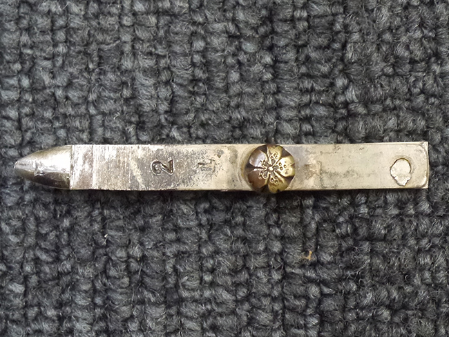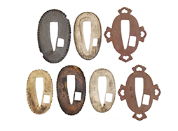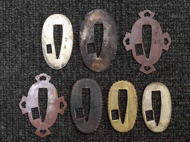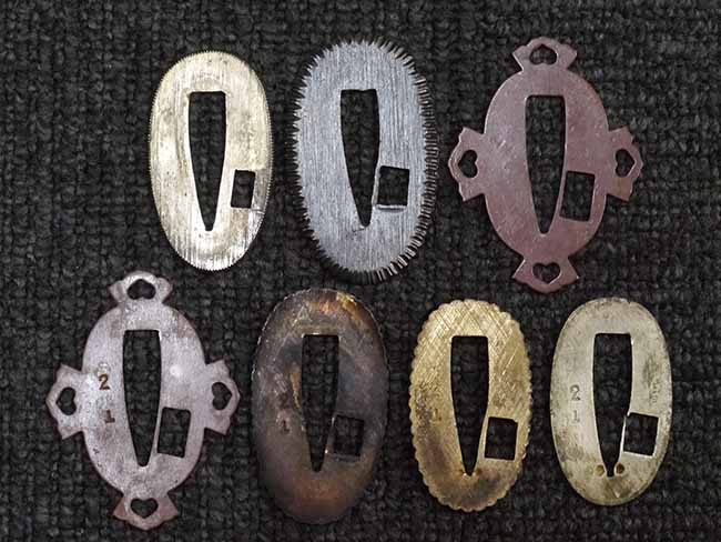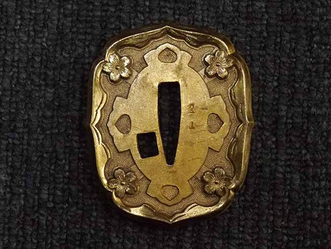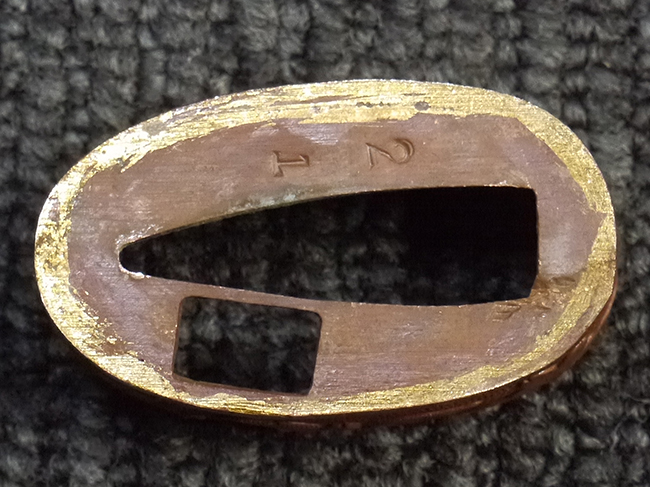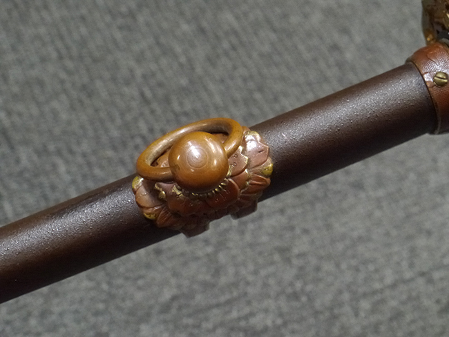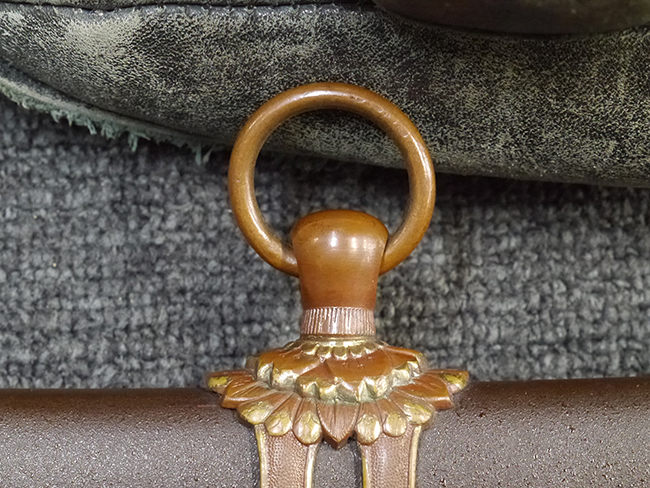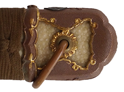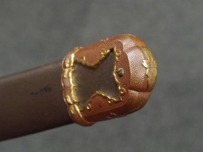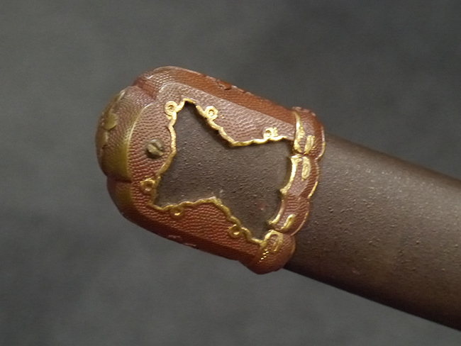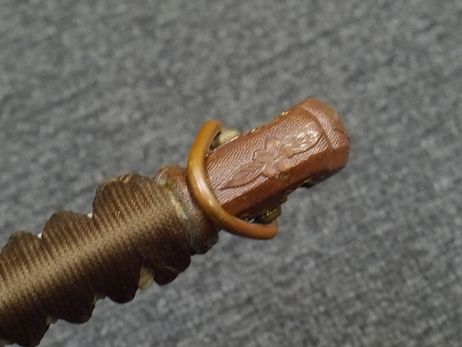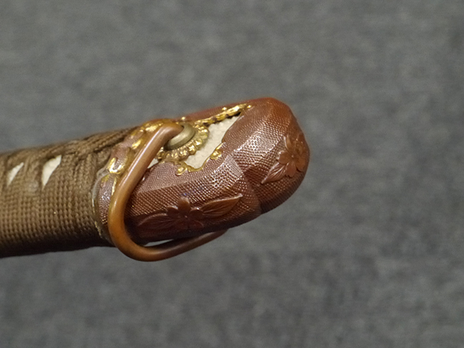 比較的長寸の刀身が入っていたと思われる柄、鞘ともに長い拵えです。 鍔は透かしの無い型打鍔となっており、切羽は7枚となっています。 鍔に切羽、柄と駐爪、そして縁に「21」と揃いの打刻がされた品です。 猿手は桜花葉模様のないプレーンな金属猿手です。 駐爪は発条(バネ)の状態も問題はありませんが、つなぎとの相性のせいか抜刀時に若干の固さが見られます。 兜金に丸に違い鷹の羽の家紋の入った柄は、親粒も見られる本白鮫で柄巻には経年による若干の使用感が見られるものの全体に良好な状態です。