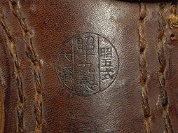 日本陸軍下士官兵用編上靴です。 靴裏には昭五式昭十九年製大橋の刻印がはっきりと確認できます。 昭和19年製ながら保存状態が良好なこともあって大戦後期の品と思えないようなしっかりとした品です。 全体にほぼ未使用と思われるほど程度の良い品です。 靴紐は戦後の物です。 靴の横には10.3文と打刻されており、断定はできませんが25cm位の方なら履くことが出来そうです。(AW)