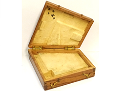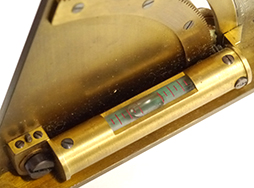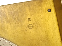 - アイテム説明四一式山砲 砲手用四分儀(木製収納箱付)です。 四分儀は円の4分の1の扇形をした目盛りのついた定規に照準目盛がついた道具で、砲兵観測・照準に使用されました。 真鍮製の四分儀本体には「阪」「〇の中に一」の刻印が見られます。 金属部は大きな腐食もなく適度な時代感がついています。 ノブの動きもスムーズで、水準器内の液泡もしっかりと確認できます。 付属の木箱も大きな破損もなくしっかりとした状態で、内部のクッションも健在です。 箱内部には「阪」「9 十五」「カ」、大砲が交差した大阪砲兵工廠製のスタンプが押印されています。 (TK)
