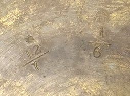 日本海軍大型薬莢です。 口径は13.5cm、薬莢長は31cmとなっています。 装薬等は一切入っておらず、ねじ込み式の雷管及び火管が完全に取り除かれている安全品です。 底部には錨や丸の中にサの刻印、12/7、1/6、S 1/13 OYDなどの刻印が見られます。 口には僅かな歪みが見られますがほとんど気にならない程度の物です。 (TK)