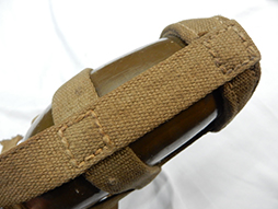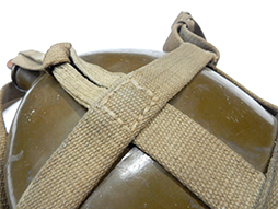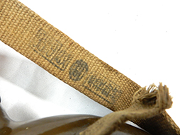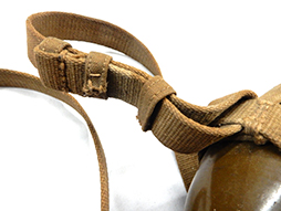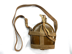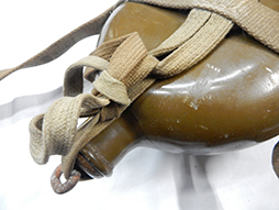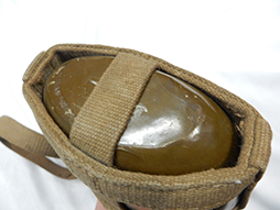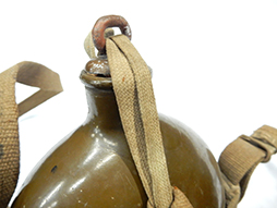 陸軍九四式(乙)水筒です。 昭和8年頃から陸軍の下士官兵用水筒として終戦時まで使用されました。 九四式水筒には留め紐が革製の甲型と、この品のような紐で留める乙型がありました。 負い紐や水筒の底面には検印や刻印も確認出来ます。 経年感は見られますが大きな破損は見られず、大変良い状態を保っています。(AW)