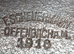 第一次世界大戦末期に作られた茶革製のルガー P-08専用 ホルスターです。 「F.Scheuermann, Offenbach A.M.1918」の刻印が入っています。 F.Scheuermann社はライン地方のOffenbach am Mainにあった「Fried. Scheuermann」社製です。