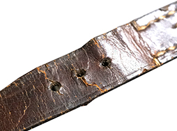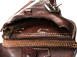 比較的濃い茶革製で革には使用感があるものの100年以上前の品と考えれば良い状態の品です。 蓋を留めるベルトに使用感があります。 第一次世界大戦中の現存品が非常に少ないのでとても珍しいです。 第一次世界大戦中のP-08ホルスターは第二次世界大戦中の品と良くは似ていますが、裏面の中央(ベルト・ループの下)を横切るステェチが無いのが特徴です。 (MM)- 詳細画像