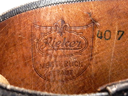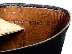 第二次世界大戦中に軍用ブーツの生産で有名なRIEKER社製の将校用黒革ブーツです。 内部にRIEKERの型押しロゴと「40 7 49191 2」のスタンプが入っています。 経年感は見られるものの革は柔軟で全体に状態の良い品です。 踵には馬蹄型の金具が打たれていて外から計測しますとサイズは爪先から踵までは約27.5cm、高さは約47cm、ブーツ全体は比較的細身の作りとなっており、ふくらはぎ部分の最も太い箇所の内径は約37cmとなっています。 (MM)(AW)