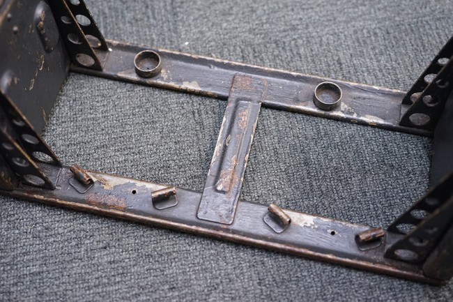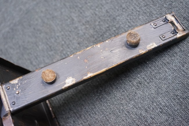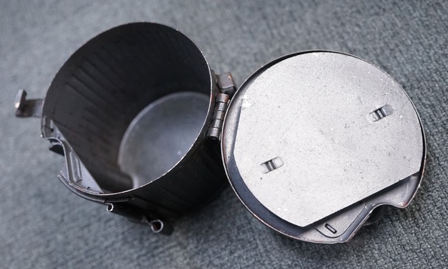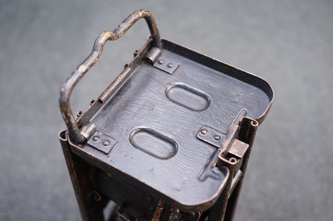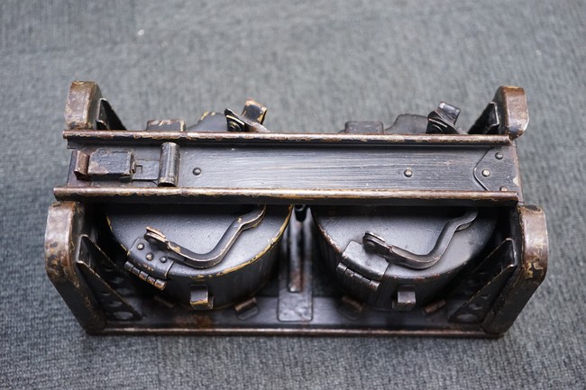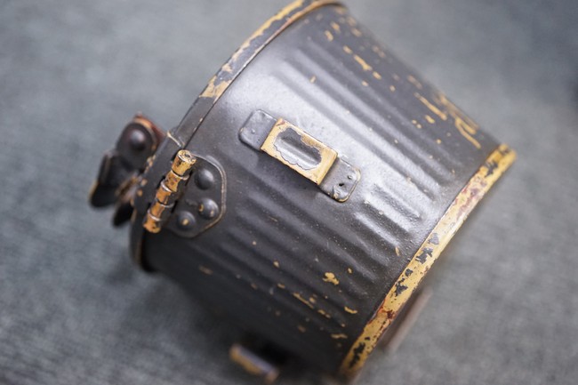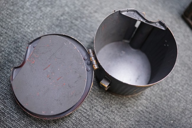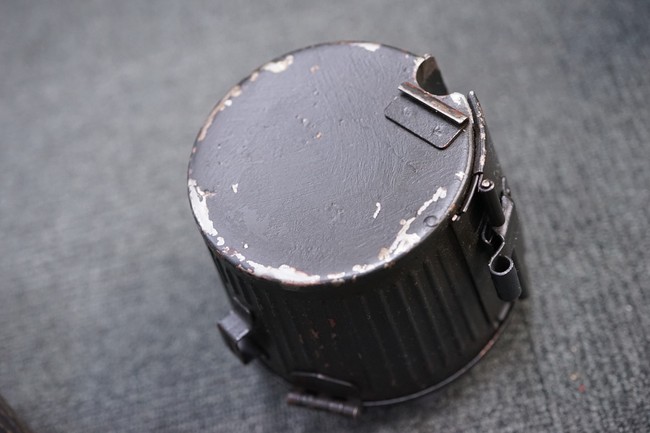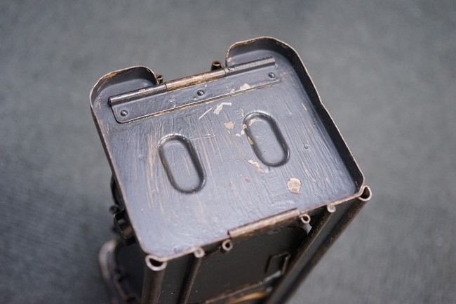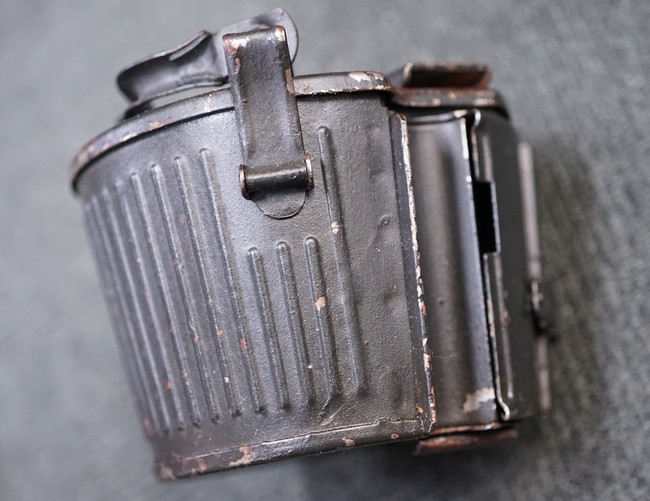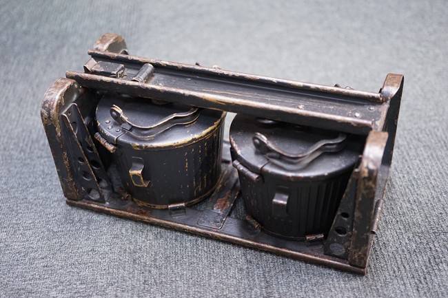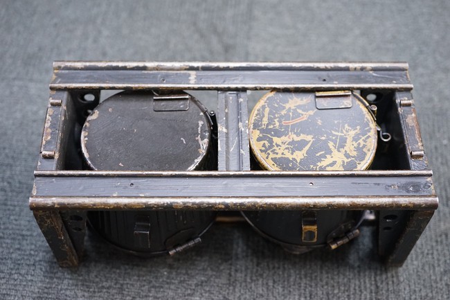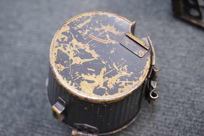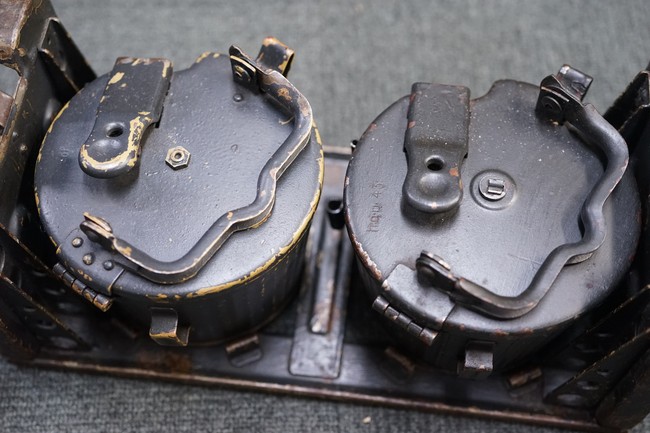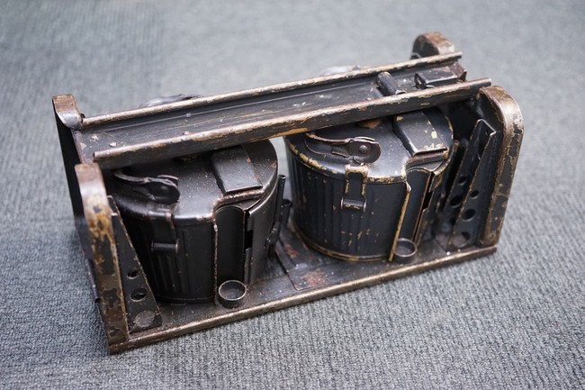 MG34/42用バスケット・マガジン 2個セット(コンテナ付)です。 バスケット・マガジンにはそれぞれddfやh.q.u.43のレター・コード見られます。 各部ともタン・カラーの上にダーク・グレーの塗装が施されており、それらが剥落して自金が露出している部分が散見されます。 無くなりやすいコンテナのフェルトの抑えが残っており、バスケット・マガジンの固定も問題ありません。 スターター・タブ、アモ・ベルトは付属していません。(YS)
