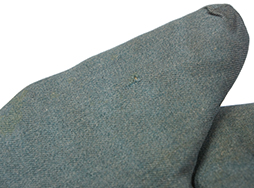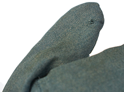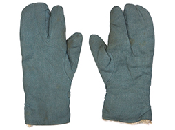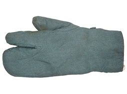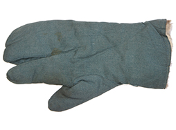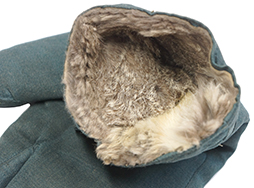 本ミトンの表地は青緑の警察色のコットン・ツイル製で、裏地にはラビットファーが張られています。 ミトンの親指と人差指はトリガーを引けるように分かれた構造となっており、手首部分には締め付け調整用のストラップ及びバックルが取り付けられています。