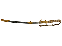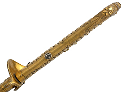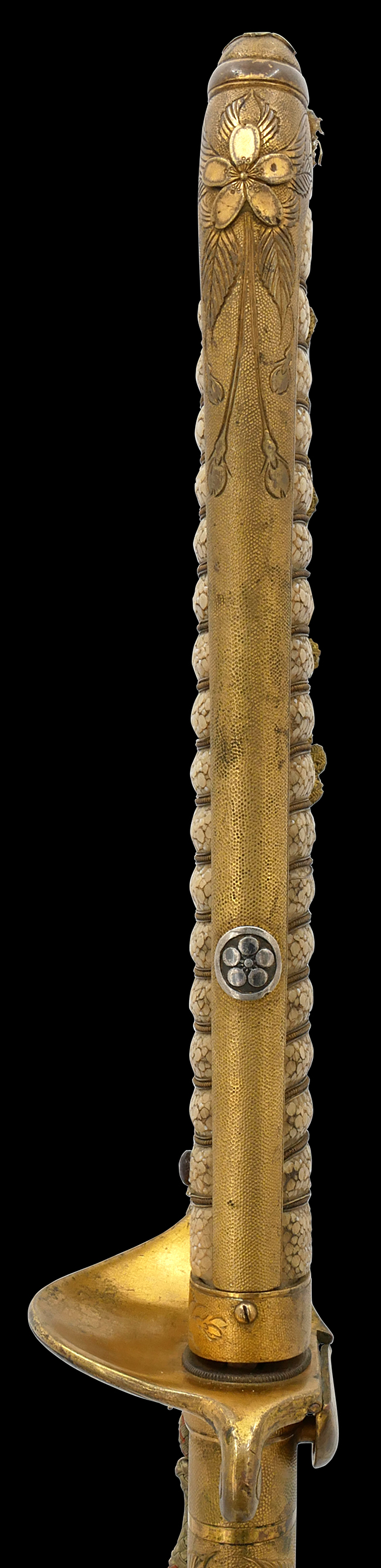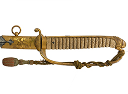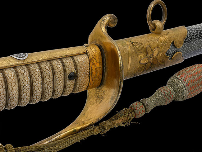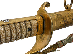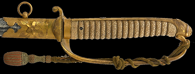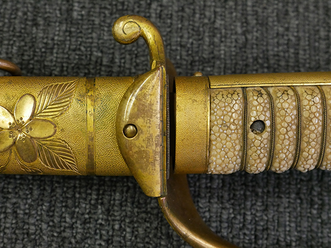 明治十六年制の海軍士官長剣は英国海軍士官サーベルに倣い、柄は片手で握りやすい形状で欧米風に柄頭が内側に反っていました。 また柄の護拳と背金上面二ヵ所に錨が付いており、金具の桜花葉は小さく数が多いのが特徴です。