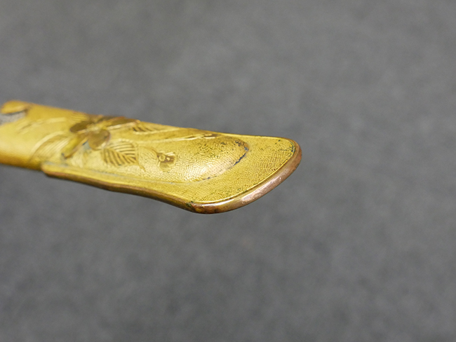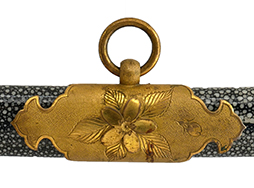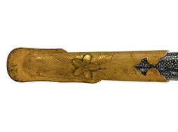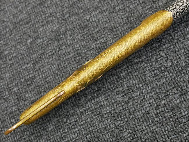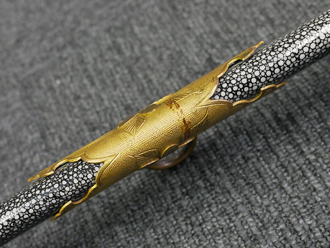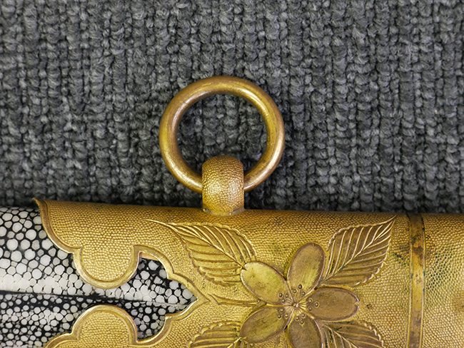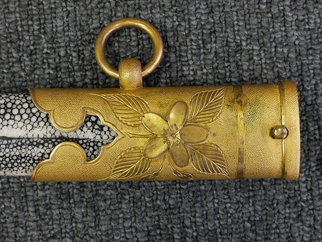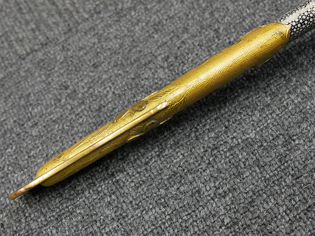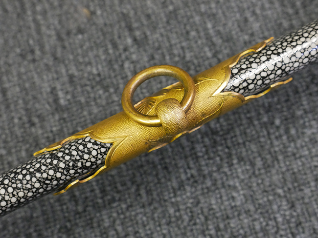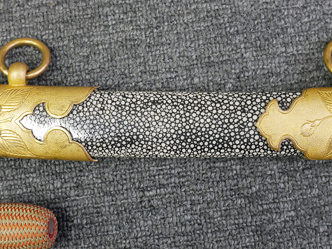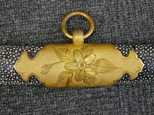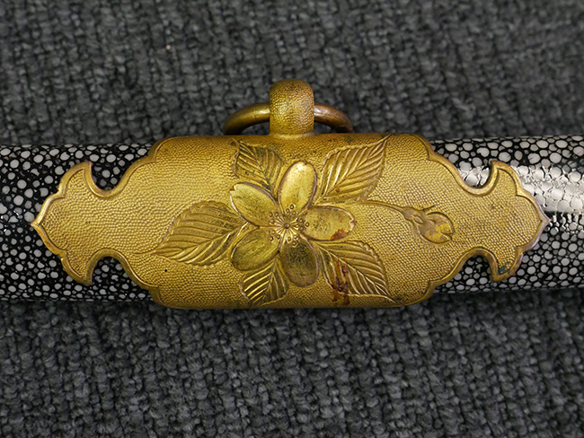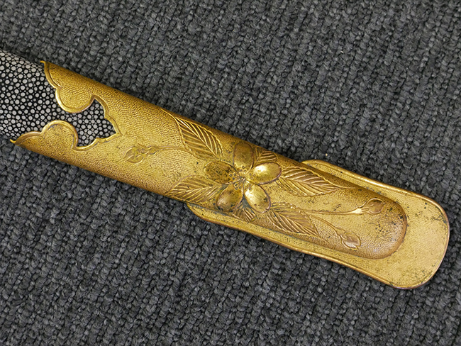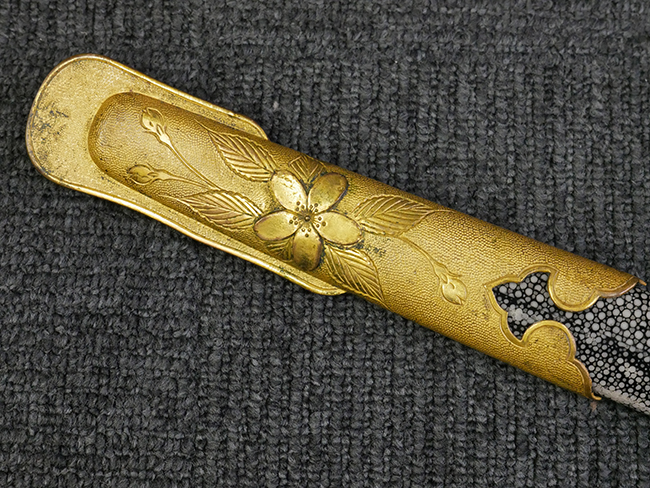 柄:白鮫皮・金線巻 護拳に桜花葉高彫模様、鍔兼用折りたたみ刀身止錠蓋