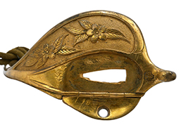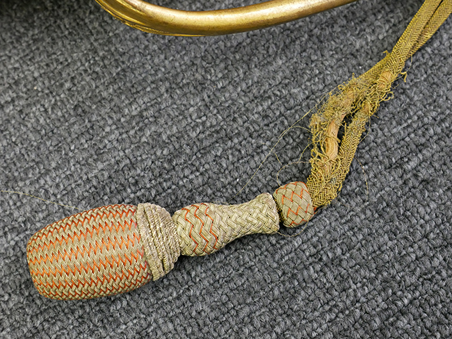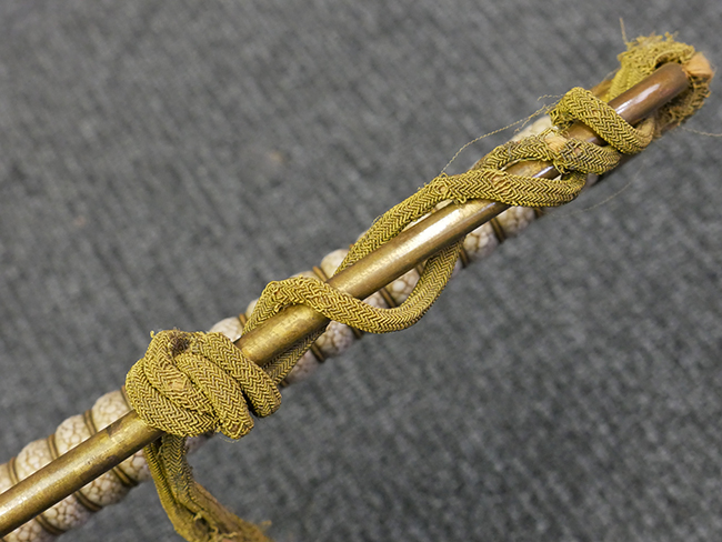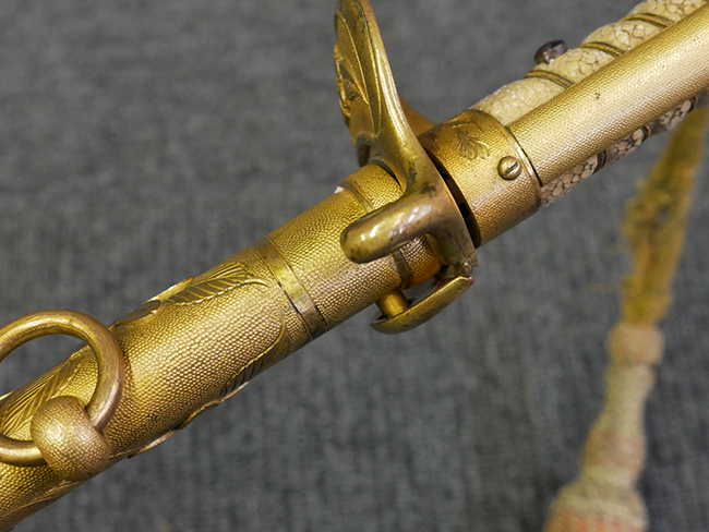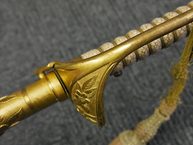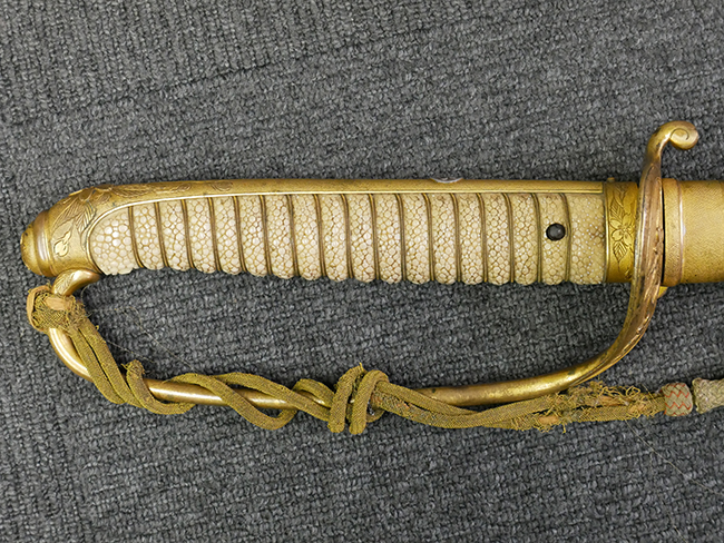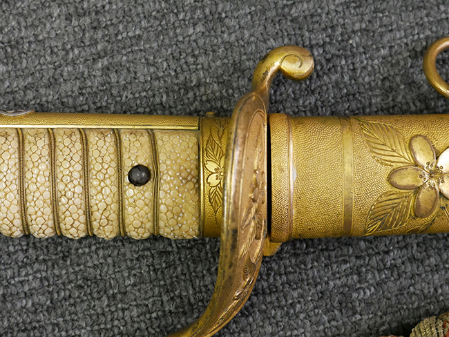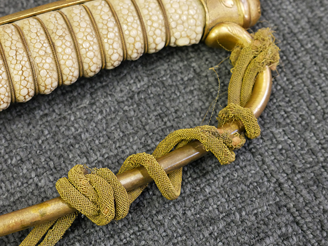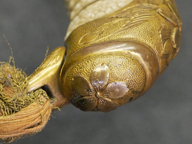 貼付桜花と記載しているのは高彫かも知れませんが、あまりにもゴリッとした立体感があるので別部品である貼付としました。 東京店4階の軍刀コーナーに現物を展示中ですので、是非ご覧になってその作りの良さを見てください。 本品に合った金モールの正刀緒が付属していますが、紐の部分のモールの一部に傷みがあります。 房部分は多少の変色はありますが完全です。 (MM)