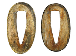 上の金具: (表)貼付一枚桜花、毛彫蕾葉枝、 (裏)表と同じ