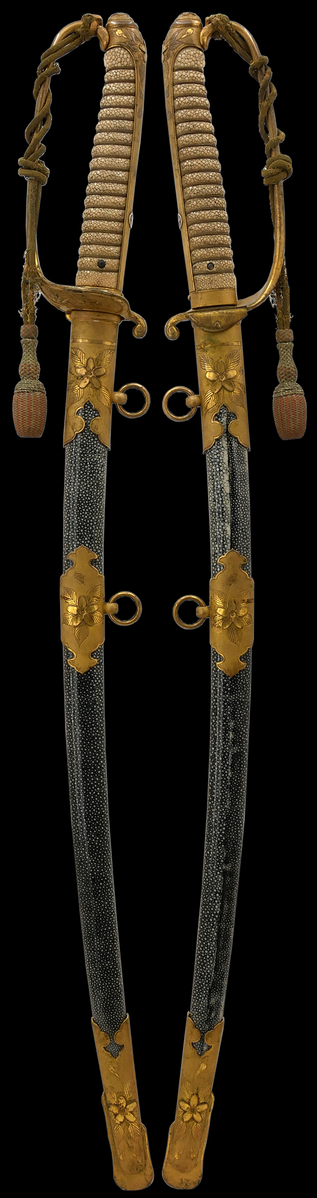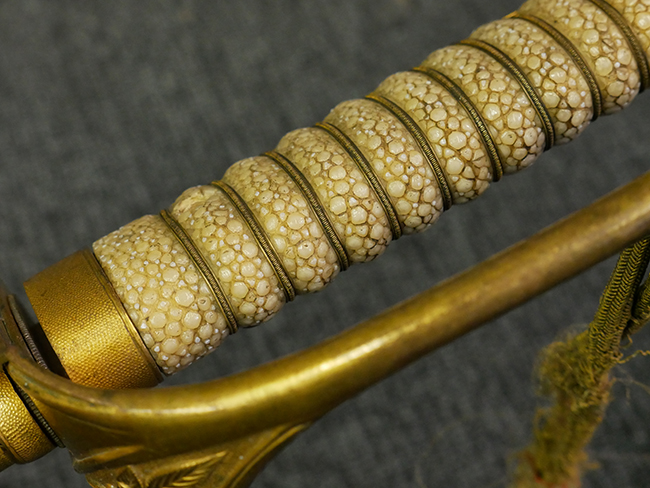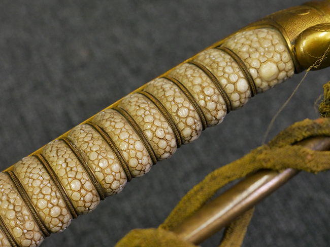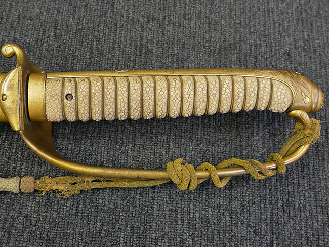 明治十六年以降も長剣に日本刀を仕込む事が多く、通称旧型軍刀と呼ばれました。 本品も中に日本刀が仕込んであった旧型軍刀です。 海軍旧型軍刀は片手握りと呼ばれる「柄の比較的短いモデル」と両手握りと呼ばれる「柄の長いモデル」があり、本品は柄の長い両手握りと呼ばれています。 一般的には陸海軍共に「片手握り」の方がと「両手握り」より古いとされています。 昭和初期の写真を見ても多くの海軍士官が「両手握り」の軍刀を佩刀しています。 特に上海事変の勃発により、海軍士官の長剣に対する認識が礼装時の(儀礼)長剣を兼ねる「片手握り」よりも、より実戦的な「両手握り」が一般的になりました。