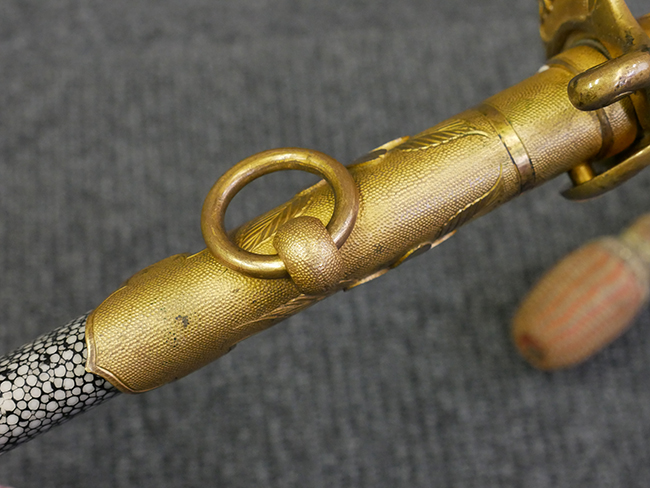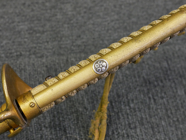 弊社の元代表(現しかご堂)が45年以上の間、数多くの海軍長剣を扱ってきましたが、(両手握りの)旧型軍刀はそれほど多くありませんでした。 特に最近は売り物が少なく海軍の軍刀を集める上で必ず必要な品となり質と程度の良さ、更に大正三年制という希少価値を踏まえると最高の品と言えるでしょう。 柄の金線(太一本、細二本)は完全に残っていおり、大粒の親鮫を使った白鮫皮も欠点のない状態です。 本商品は拵え(外装)のみで刀身は入っておらず、中身は刃渡り64.5cmの木製のツナギが入っています。 本品には刃渡り70cm弱の標準的な長さと反りの日本刀(刀)が仕込めます。 柄背に「丸ニ梅鉢紋」の銀製家紋付いています。 本品は下記のような桜花葉模様が施されています。 非常に程度の良い漆で砥ぎだした鮫革鞘は大きな粒が白色に現れた明るい仕上げになっています。 全ての金物の金鍍金は僅かに曇りはあるものの後世の磨きの入っていないオリジナルの状態で、金物全てが同じような程度で部品間の違和感がなく、全てが当時から同じである事が判ります。 黒牛角目釘付き。