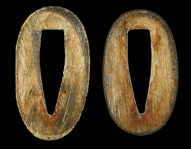 下の金具: (表)貼付四枚桜花、毛彫蕾葉枝、 (裏)表と同じ