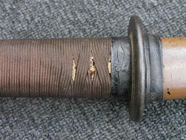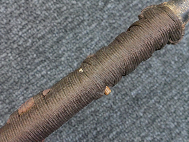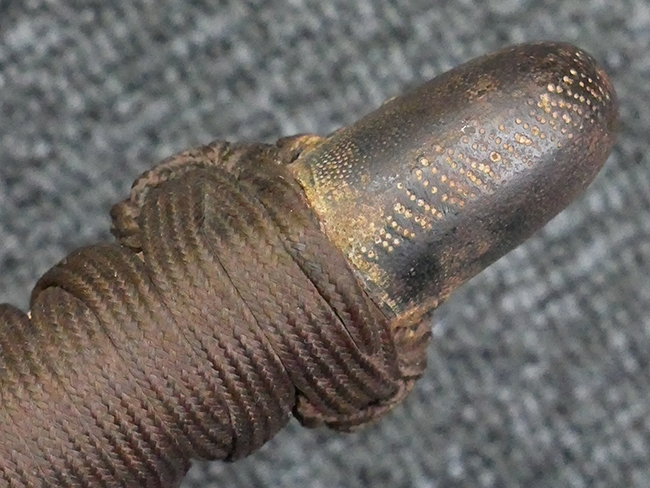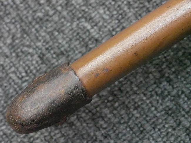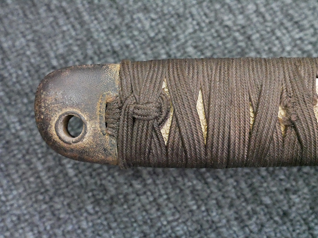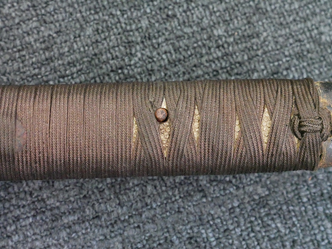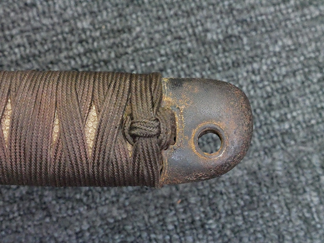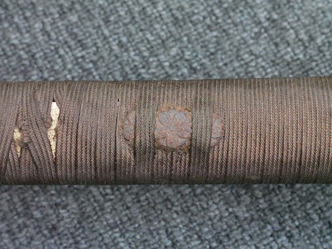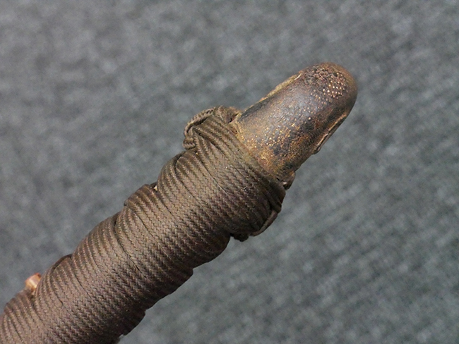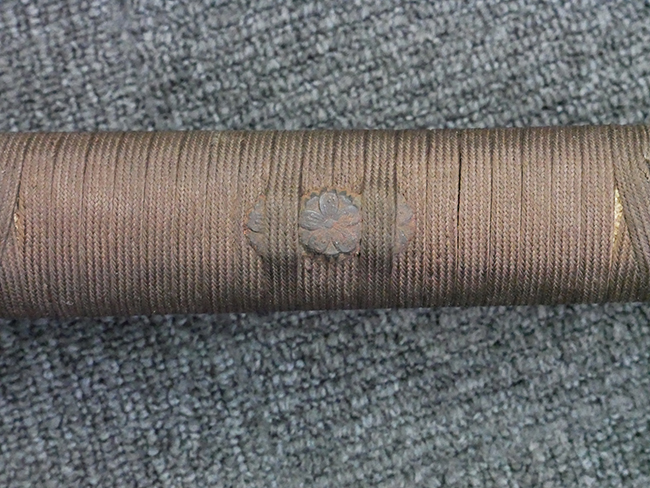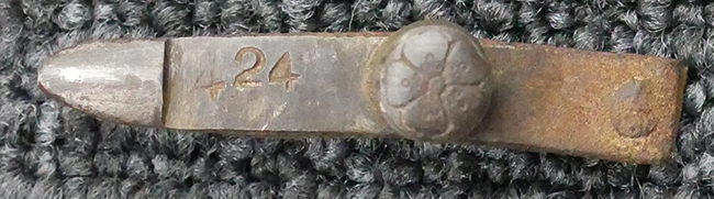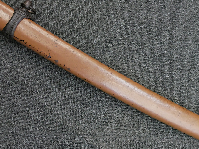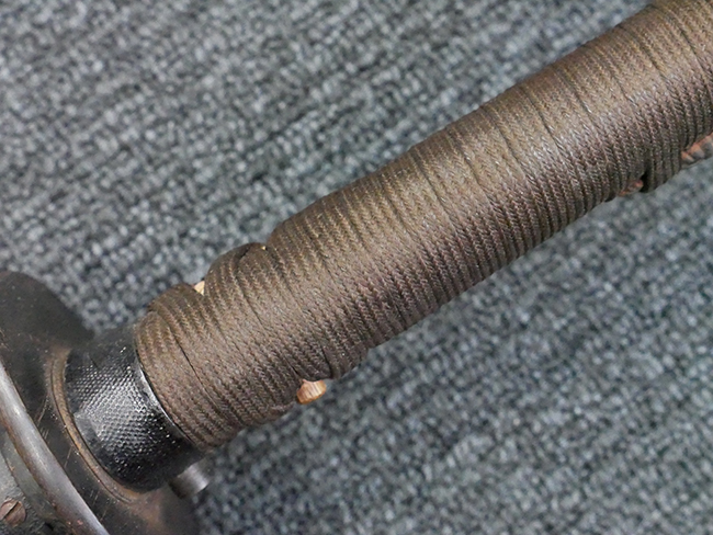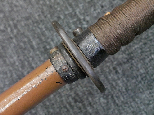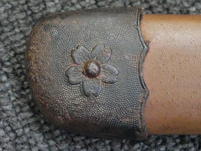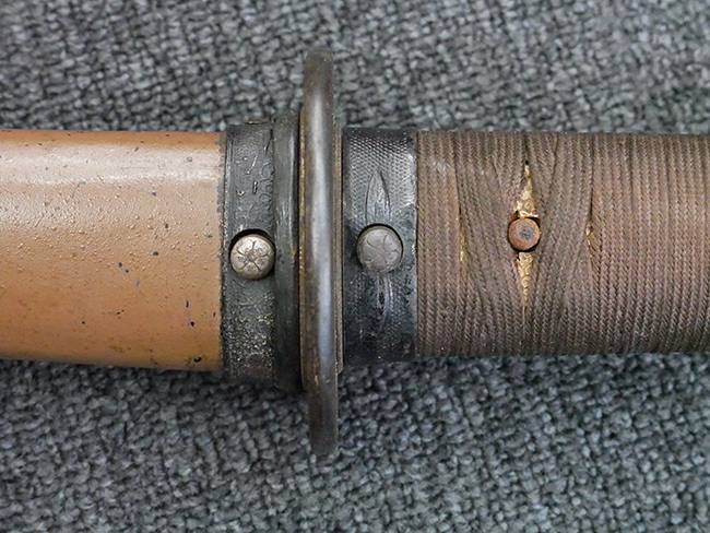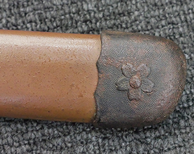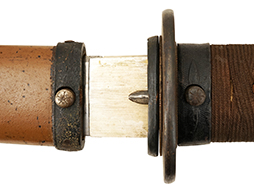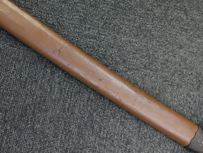 揃いの切羽は前後1枚ずつの計2枚、刀身側には防塵切羽(二分割防塵口金)が取り付けられており、それぞれ「424」の算用数字刻印が入っています。 はばきは真鍮製で、白金系の鍍金が施されており、縁金具には桜花二枚葉の彫りが見られます。 駐爪は鉄製で発条のテンションもしっかりと残っており、作動はスムーズでロックもしっかりと掛かります。 駐爪にも「424」の刻印が打たれています。 柄は小粒なものの鮫皮が使用されており、一部に剥落が見られます。 鉄製の三連目貫にはやや錆が散見されます。 柄内部には「四二四 424」の漢/算用数字の書き込みが見られます。 柄巻は柄糸漆塗省略の末期仕様で、一部にやや解れなど弱くなっている箇所が見られますが、現状切れはありません。 柄の目釘穴は2個の仕様です。 鞘は鉄製で国防色石目半光沢塗となっており、一部に塗装の剥落が見られますが大きな凹みはありません。 鞘口金にも駐爪留めを解除する釦が装備されています。 佩鐶はやや楕円状に変形していますが、動きはスムーズです。 石突には両面に桜花の彫りが施されています。 本品には目釘が2本付属しますが、目釘穴の片面が柄巻に覆われているため、目釘を抜き取る際に柄巻へダメージを及ぼしていまう恐れがあります。 そのため本品は目釘を取り外した状態での販売となります。