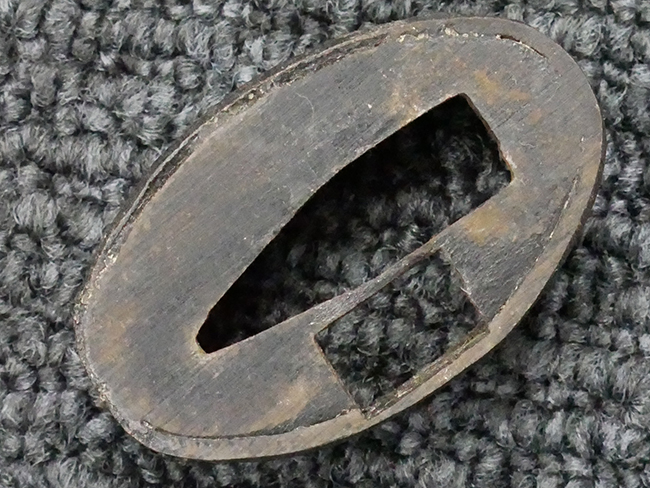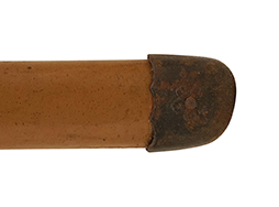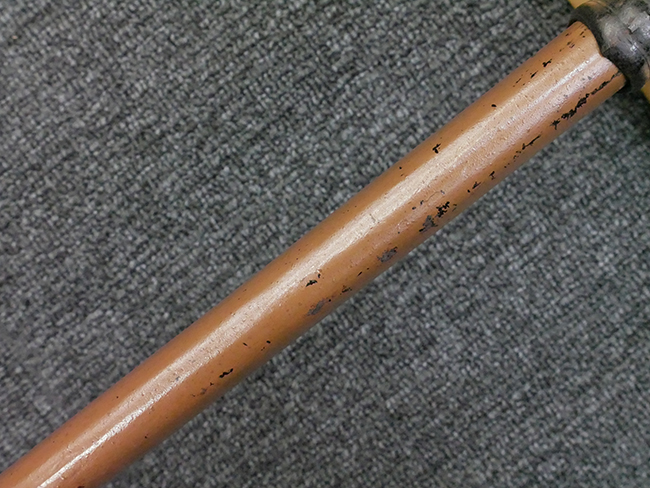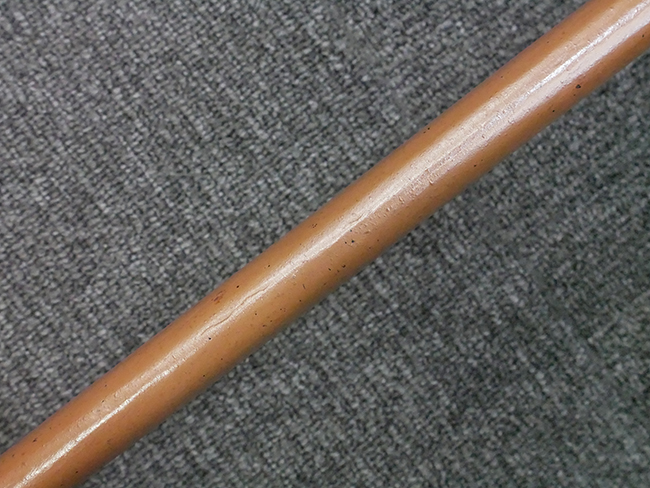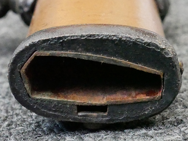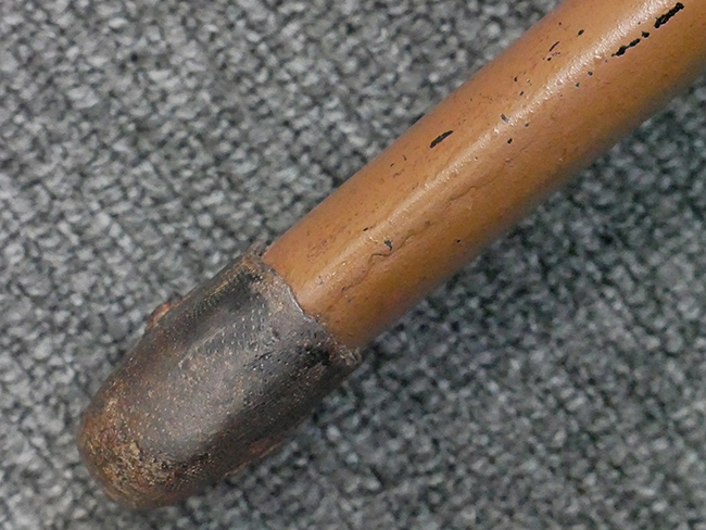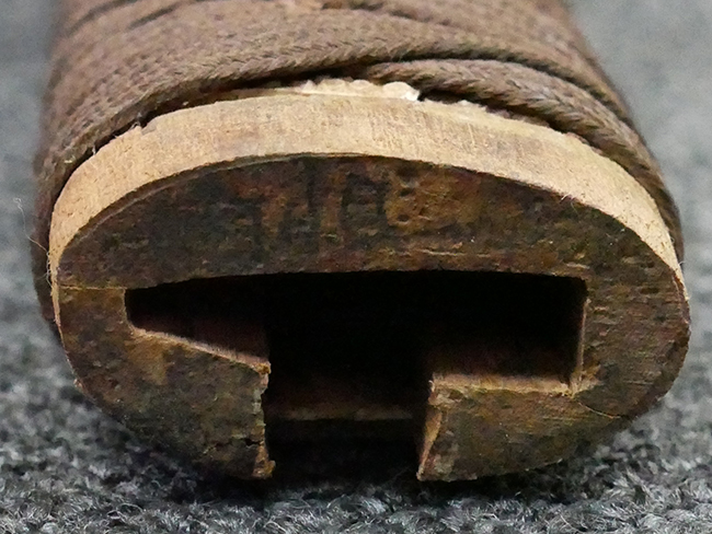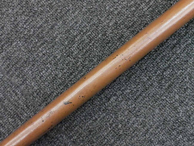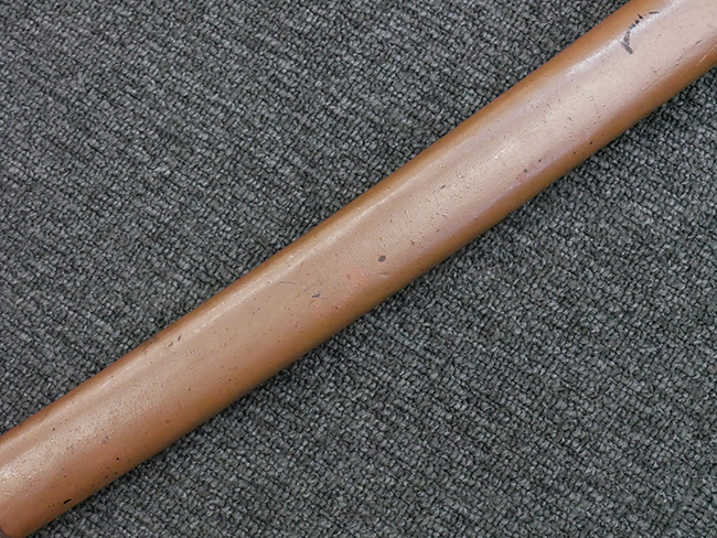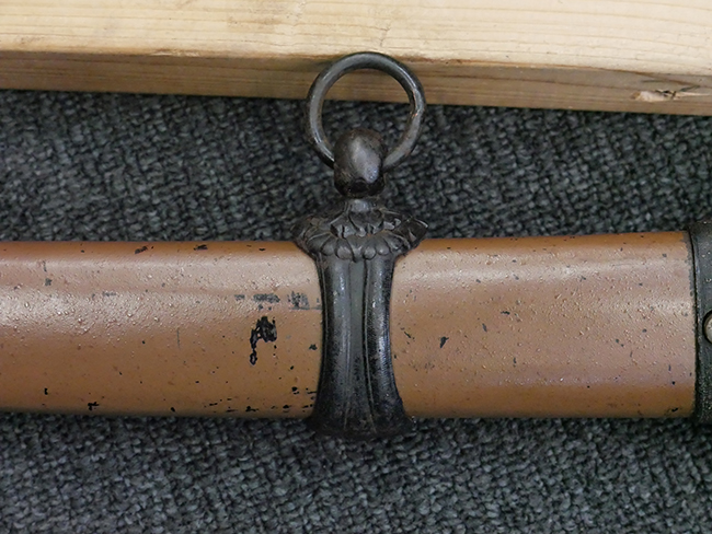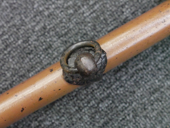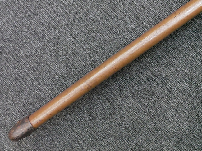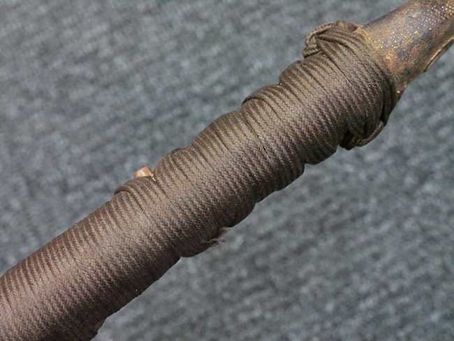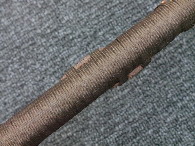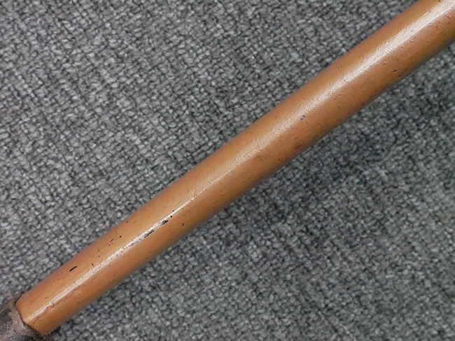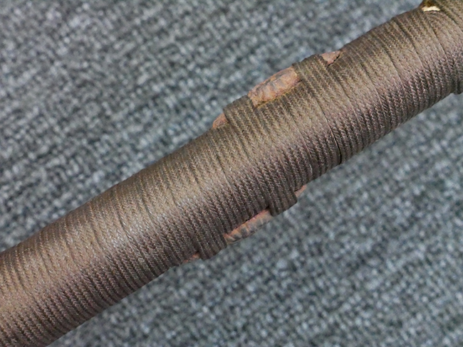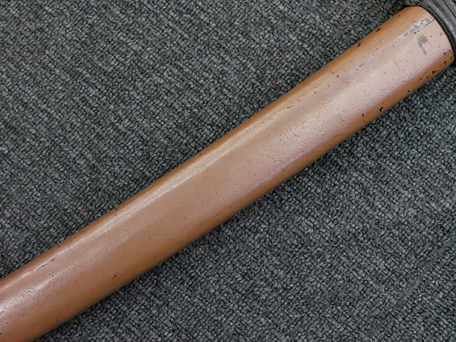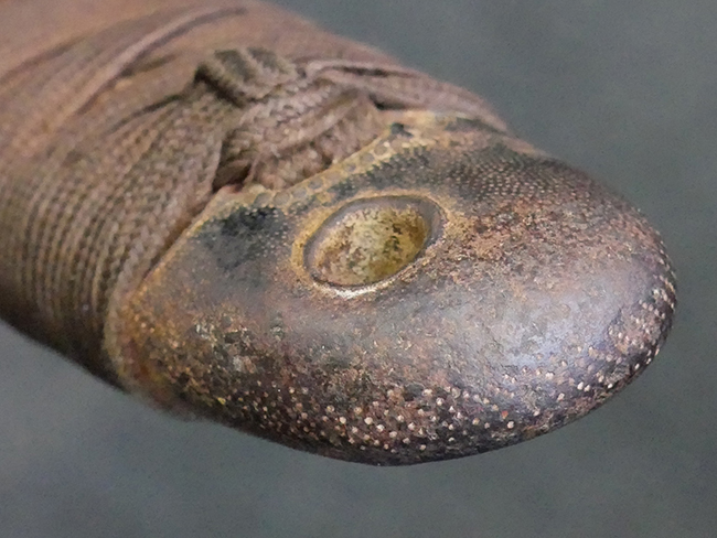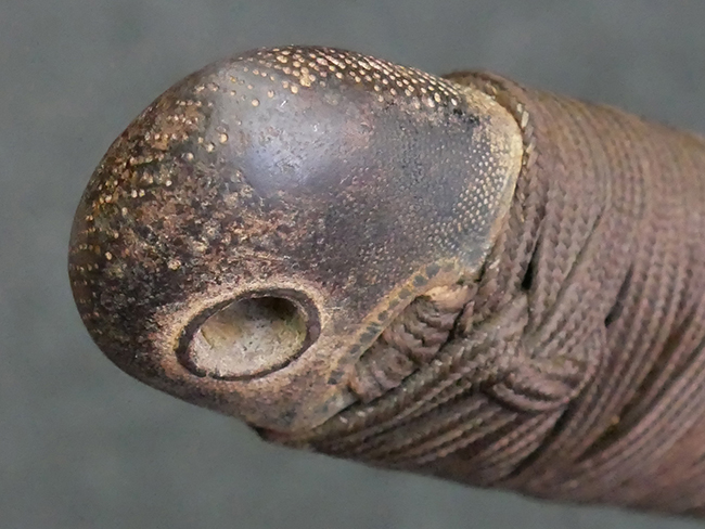 揃いの切羽は前後1枚ずつの計2枚、刀身側には防塵切羽(二分割防塵口金)が取り付けられており、それぞれ「424」の算用数字刻印が入っています。 はばきは真鍮製で、白金系の鍍金が施されており、縁金具には桜花二枚葉の彫りが見られます。 駐爪は鉄製で発条のテンションもしっかりと残っており、作動はスムーズでロックもしっかりと掛かります。 駐爪にも「424」の刻印が打たれています。 柄は小粒なものの鮫皮が使用されており、一部に剥落が見られます。 鉄製の三連目貫にはやや錆が散見されます。 柄内部には「四二四 424」の漢/算用数字の書き込みが見られます。 柄巻は柄糸漆塗省略の末期仕様で、一部にやや解れなど弱くなっている箇所が見られますが、現状切れはありません。 柄の目釘穴は2個の仕様です。 鞘は鉄製で国防色石目半光沢塗となっており、一部に塗装の剥落が見られますが大きな凹みはありません。 鞘口金にも駐爪留めを解除する釦が装備されています。 佩鐶はやや楕円状に変形していますが、動きはスムーズです。 石突には両面に桜花の彫りが施されています。 本品には目釘が2本付属しますが、目釘穴の片面が柄巻に覆われているため、目釘を抜き取る際に柄巻へダメージを及ぼしていまう恐れがあります。 そのため本品は目釘を取り外した状態での販売となります。