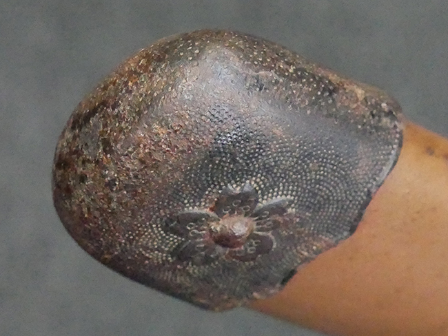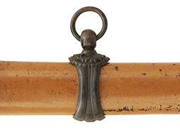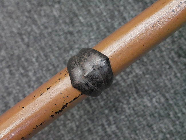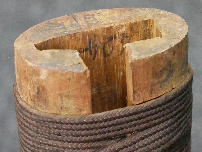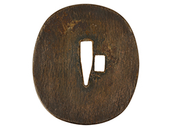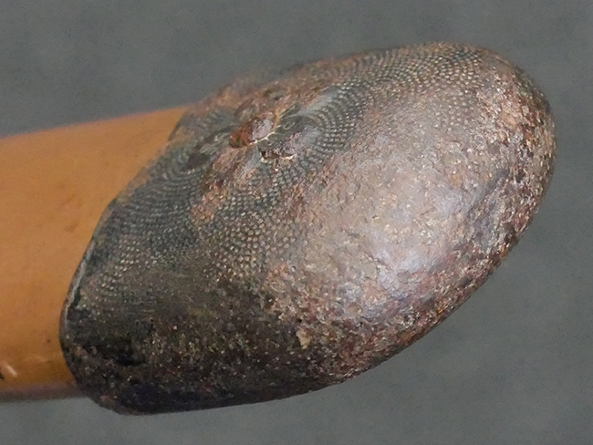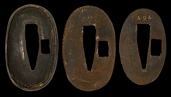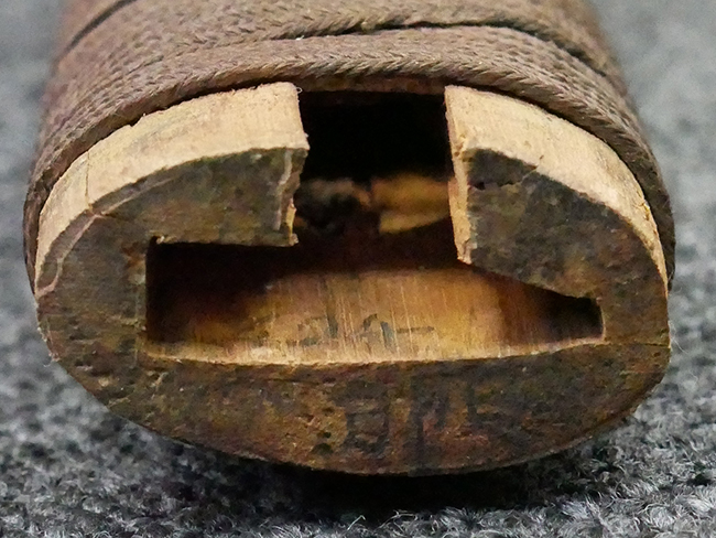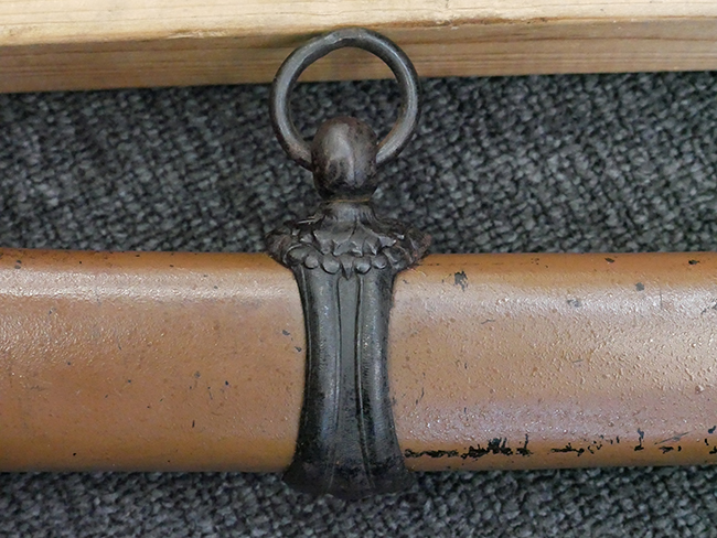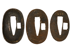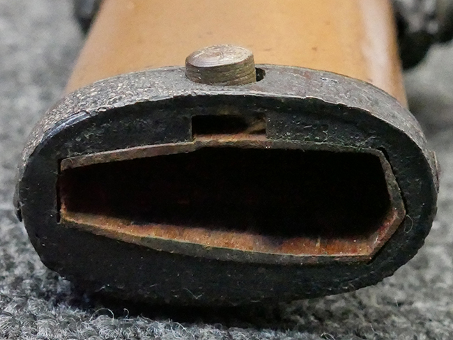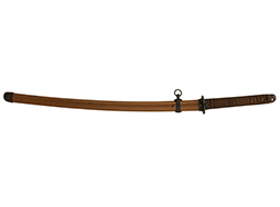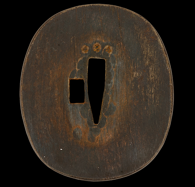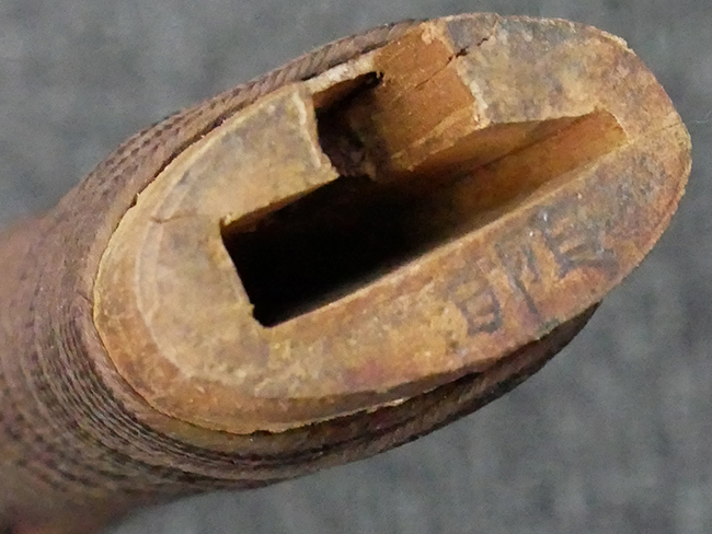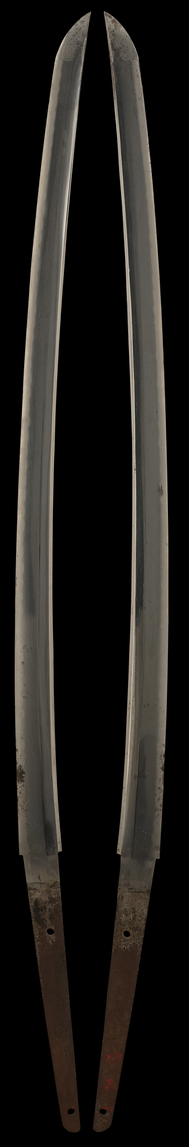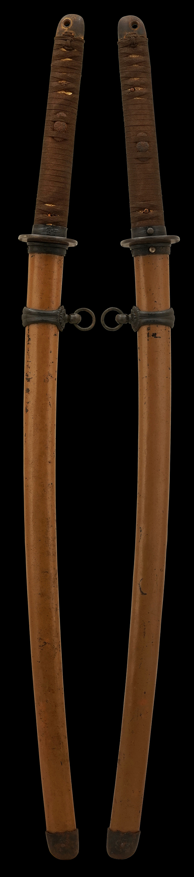 揃いの切羽は前後1枚ずつの計2枚、刀身側には防塵切羽(二分割防塵口金)が取り付けられており、それぞれ「424」の算用数字刻印が入っています。 はばきは真鍮製で、白金系の鍍金が施されており、縁金具には桜花二枚葉の彫りが見られます。 駐爪は鉄製で発条のテンションもしっかりと残っており、作動はスムーズでロックもしっかりと掛かります。 駐爪にも「424」の刻印が打たれています。 柄は小粒なものの鮫皮が使用されており、一部に剥落が見られます。 鉄製の三連目貫にはやや錆が散見されます。 柄内部には「四二四 424」の漢/算用数字の書き込みが見られます。 柄巻は柄糸漆塗省略の末期仕様で、一部にやや解れなど弱くなっている箇所が見られますが、現状切れはありません。 柄の目釘穴は2個の仕様です。 鞘は鉄製で国防色石目半光沢塗となっており、一部に塗装の剥落が見られますが大きな凹みはありません。 鞘口金にも駐爪留めを解除する釦が装備されています。 佩鐶はやや楕円状に変形していますが、動きはスムーズです。 石突には両面に桜花の彫りが施されています。 本品には目釘が2本付属しますが、目釘穴の片面が柄巻に覆われているため、目釘を抜き取る際に柄巻へダメージを及ぼしていまう恐れがあります。 そのため本品は目釘を取り外した状態での販売となります。
