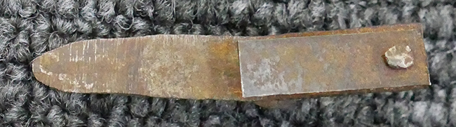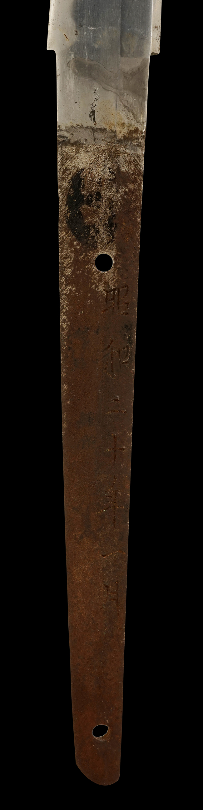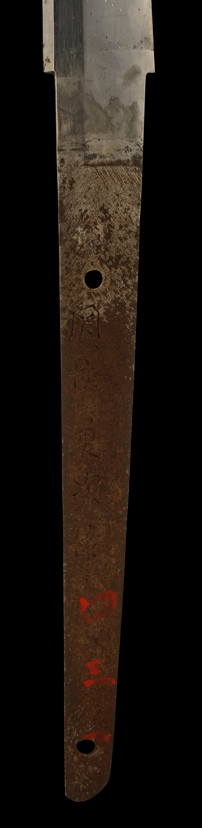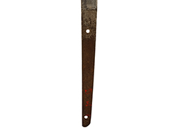 本品の刀身は軍刀として鍛造された現代刀らしく重厚感のある、しっかりとした造りをしています。 刀身にはやや疲れや錆が見られ、古研ぎですが刃切れや刃こぼれは見受けられません。 茎は生く鑢目が施されており、表銘/裏銘ともにはっきり確認できます。 表銘には当時の管理番号と思われる「四三一」の漢数字の赤文字が見られます。 また、背には「関」の刻印も見られます。