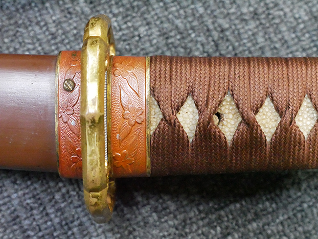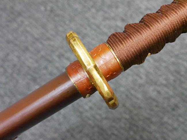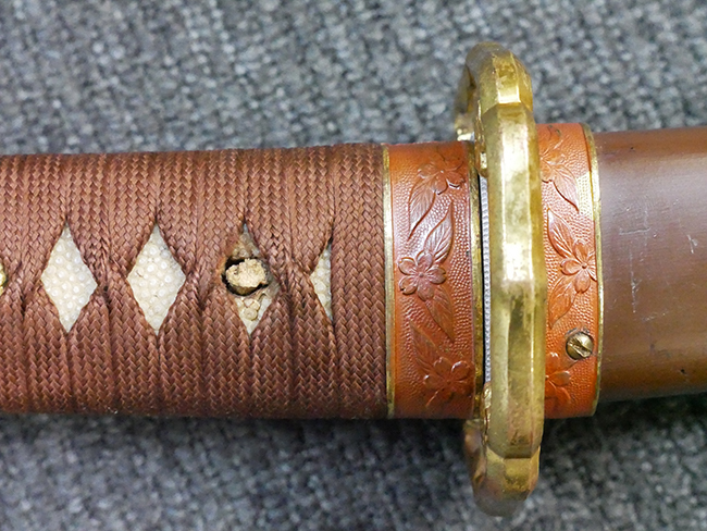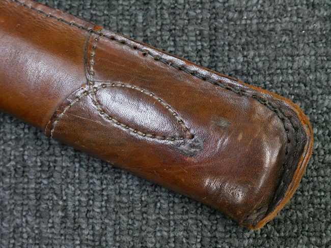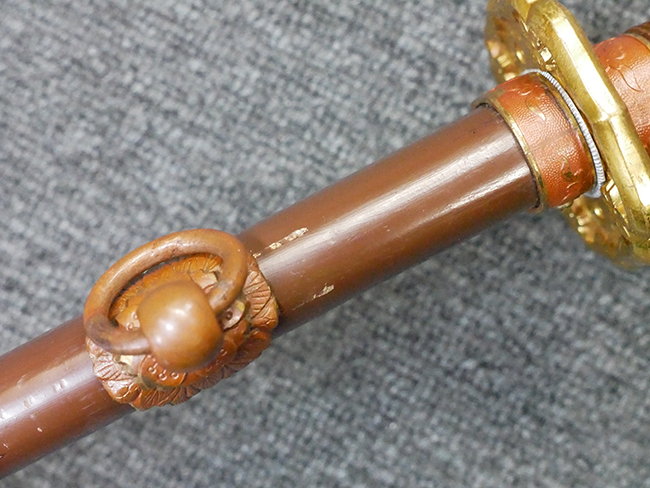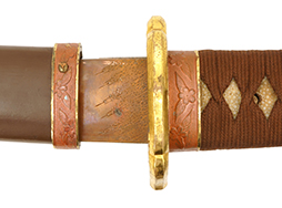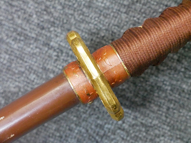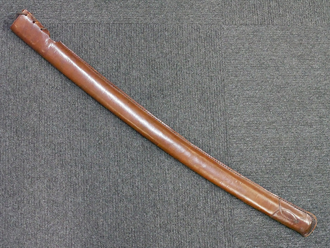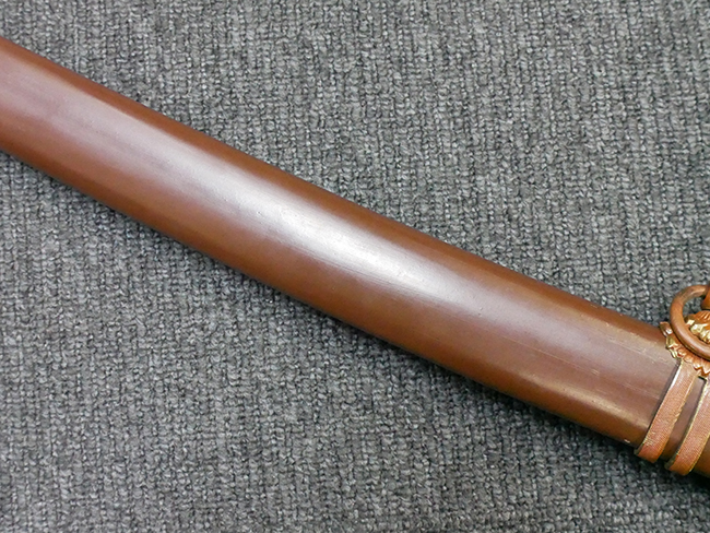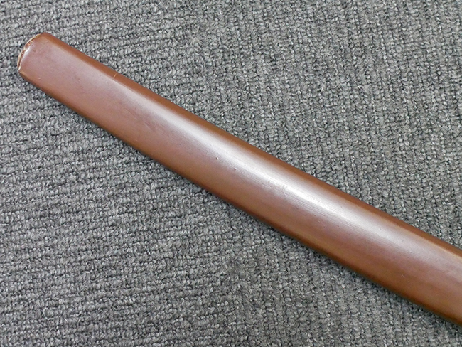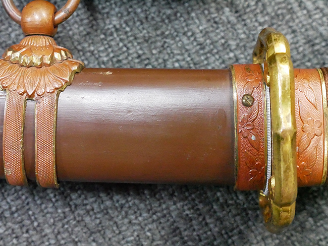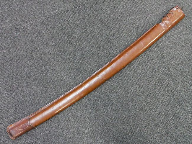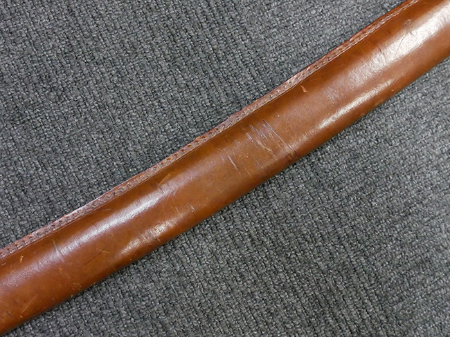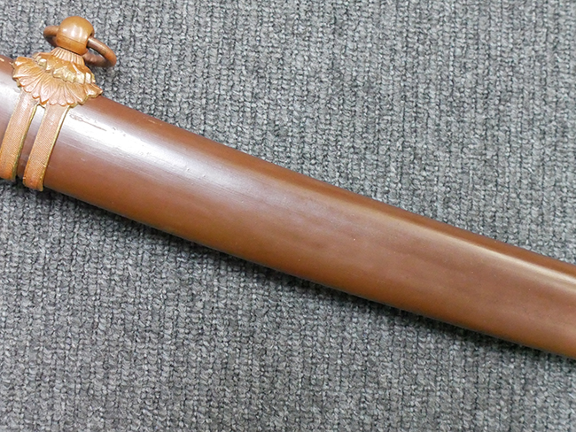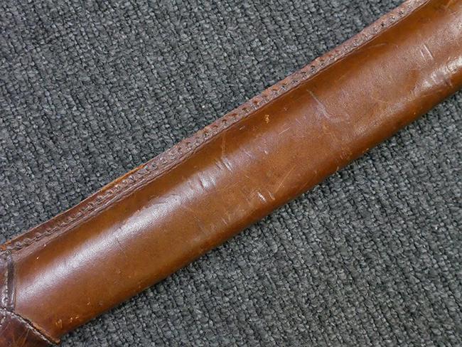 陸軍九八式軍刀の拵えに銃砲刀剣類登録証付の本身(在銘:昭和十九年二月 宗利)が入った品です。 宗利(本名:山上若吉)は新潟県刈羽郡で活動した刀匠で、陸軍軍刀技術奨励会にて会長賞を受賞した刀匠です。 本品の刀身は軍刀として鍛造された現代刀らしく重厚感のある、しっかりとした造りをしています。 古研ぎですが刃切れや刃こぼれは見受けられません。 茎は生く鑢目が施されており、まだら状に黒錆が現れ始めています。 表・裏ともに銘もしっかりと確認できます。 鍔は真鍮(黄銅)製の型打鍔で、「3」の算用数字刻印が入っています。 鍔はややモールドが甘くなっているものの魚子地仕上げが施されており、昭和十九年という時期を考えれば十分に豪華な造りとなっています。 揃いの切羽はアルミ製で前後1枚ずつ、それぞれ算用数字で3の刻印が入っており、縁金具内部にも3の刻印が入っています。 留具は「はばき留め」となっています。 留まり具合はわずかに緩くなっていますが、あまり気にならない程度のもです。 はばきは銅製で鏨による斜め装飾が施されています。 柄は小粒なものの白鮫革が使用されており、柄巻の解れや毛羽立ちといった使用感も殆ども見られず良好な状態が保たれています。 猿手は金属製で、側面には桜花、底面には猿が両手を握った意匠(猿手の語源)が施されています。 猿手は大きな変形もなく動きはスムーズです。 鞘は茶褐色半光沢塗のアルミ製で、略式外装のため外装金具(責金、石突)は当初から装着されていません。 佩鐶は鉄製茶褐色塗装、座金は真鍮製となっています。 野戦用革覆が装着されており、革は柔らかさや艶ともに健在です。 革覆の丸紐終端にはやや解れが見られ、紐を通す穴部分に一箇所断裂が見られるため、着脱には注意が必要です。 外装全長約98.7cm、柄全長約25.4cm。(TK)