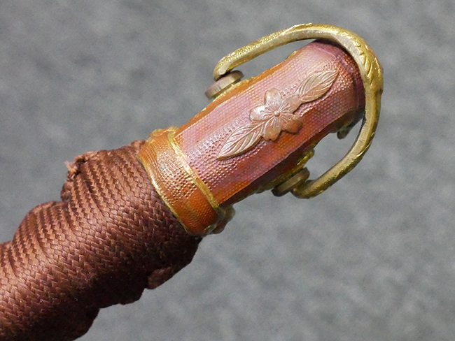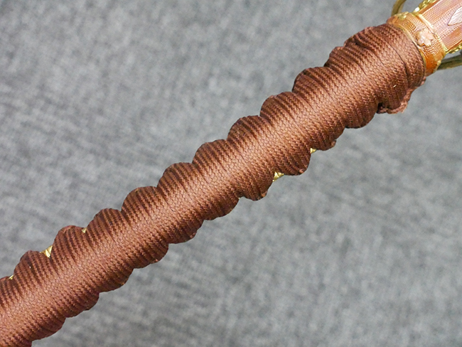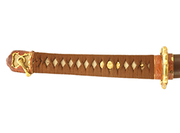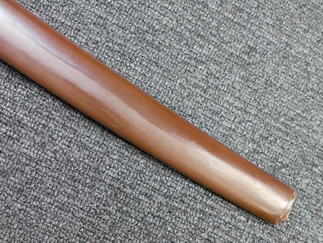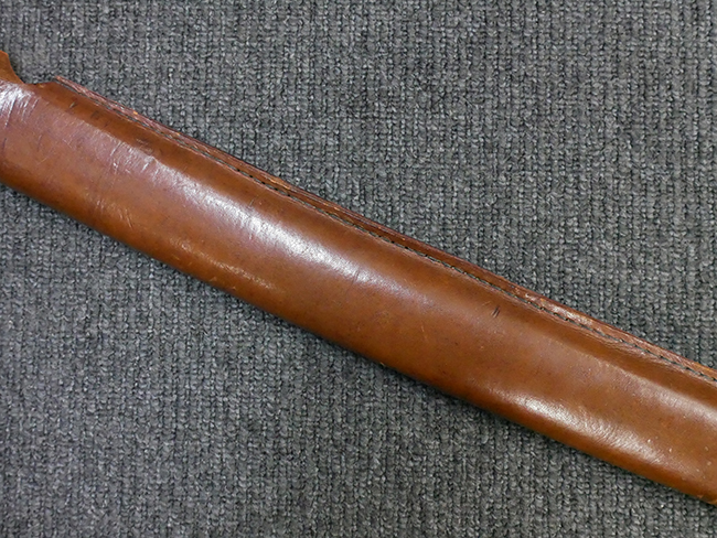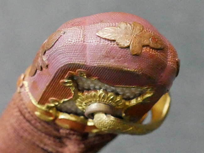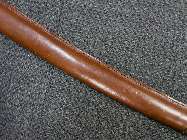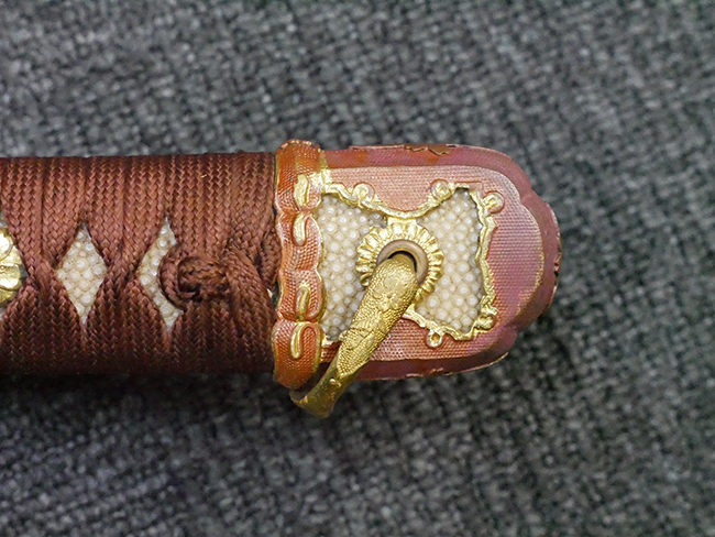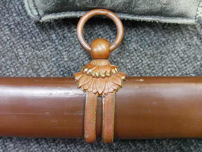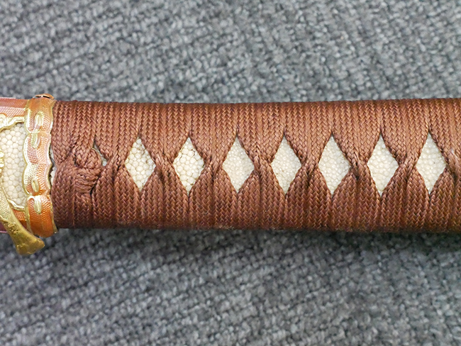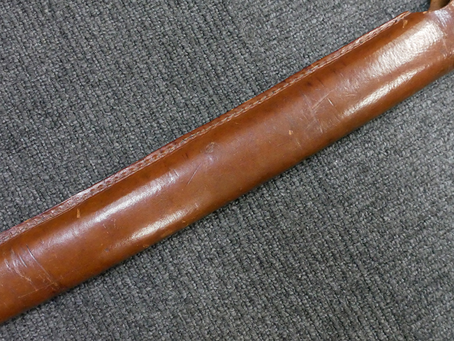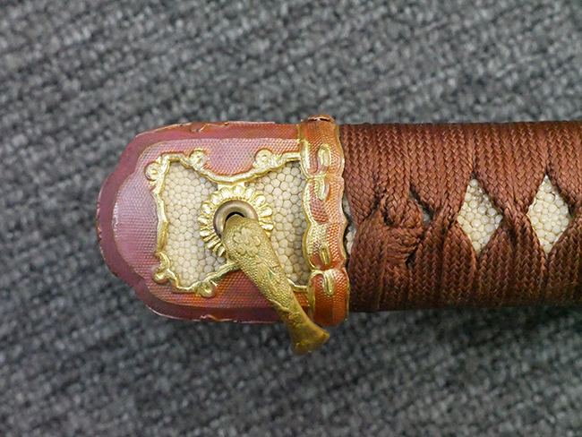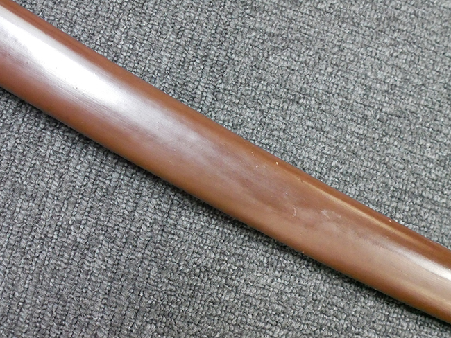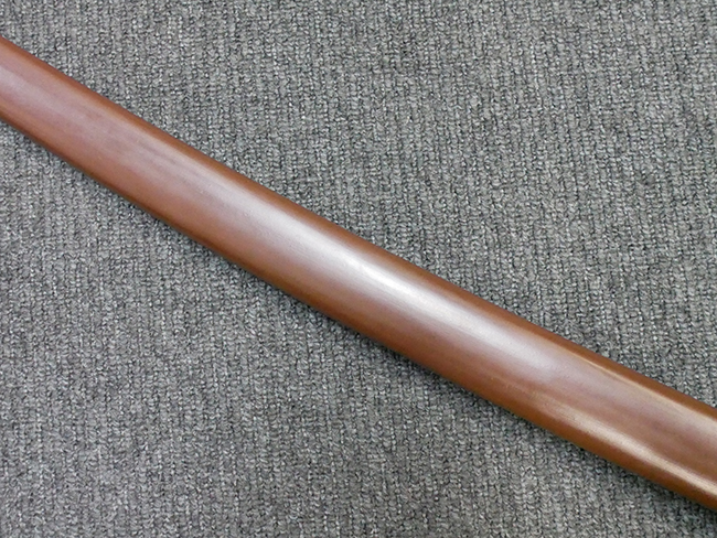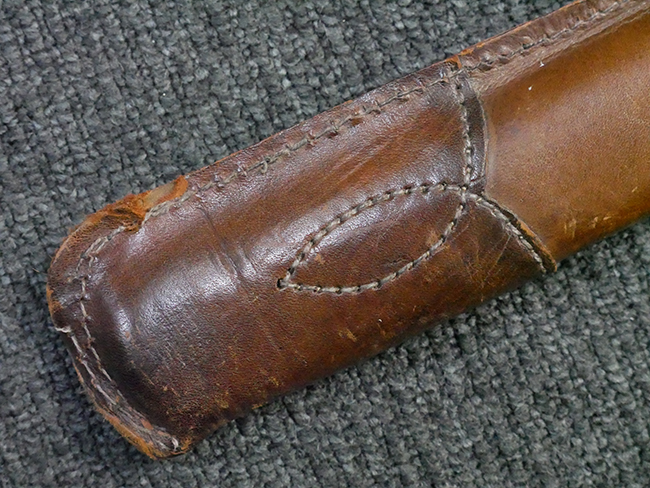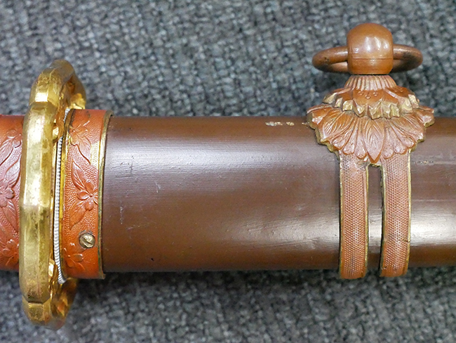 陸軍九八式軍刀の拵えに銃砲刀剣類登録証付の本身(在銘:昭和十九年二月 宗利)が入った品です。 宗利(本名:山上若吉)は新潟県刈羽郡で活動した刀匠で、陸軍軍刀技術奨励会にて会長賞を受賞した刀匠です。 本品の刀身は軍刀として鍛造された現代刀らしく重厚感のある、しっかりとした造りをしています。 古研ぎですが刃切れや刃こぼれは見受けられません。 茎は生く鑢目が施されており、まだら状に黒錆が現れ始めています。 表・裏ともに銘もしっかりと確認できます。 鍔は真鍮(黄銅)製の型打鍔で、「3」の算用数字刻印が入っています。 鍔はややモールドが甘くなっているものの魚子地仕上げが施されており、昭和十九年という時期を考えれば十分に豪華な造りとなっています。 揃いの切羽はアルミ製で前後1枚ずつ、それぞれ算用数字で3の刻印が入っており、縁金具内部にも3の刻印が入っています。 留具は「はばき留め」となっています。 留まり具合はわずかに緩くなっていますが、あまり気にならない程度のもです。 はばきは銅製で鏨による斜め装飾が施されています。 柄は小粒なものの白鮫革が使用されており、柄巻の解れや毛羽立ちといった使用感も殆ども見られず良好な状態が保たれています。 猿手は金属製で、側面には桜花、底面には猿が両手を握った意匠(猿手の語源)が施されています。 猿手は大きな変形もなく動きはスムーズです。 鞘は茶褐色半光沢塗のアルミ製で、略式外装のため外装金具(責金、石突)は当初から装着されていません。 佩鐶は鉄製茶褐色塗装、座金は真鍮製となっています。 野戦用革覆が装着されており、革は柔らかさや艶ともに健在です。 革覆の丸紐終端にはやや解れが見られ、紐を通す穴部分に一箇所断裂が見られるため、着脱には注意が必要です。 外装全長約98.7cm、柄全長約25.4cm。(TK)