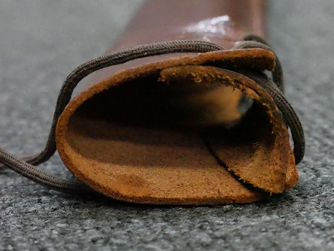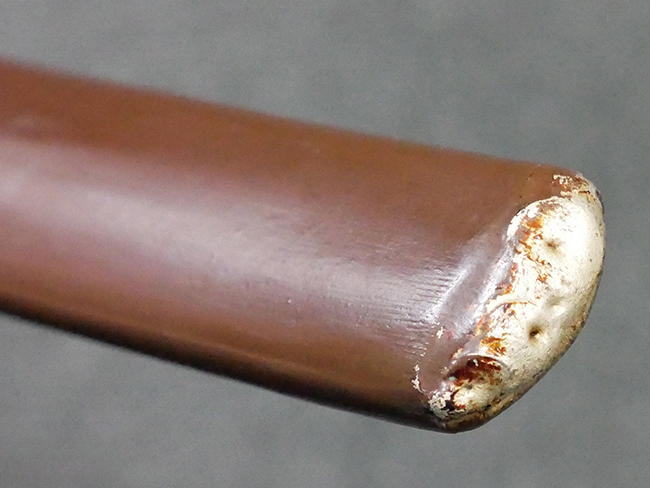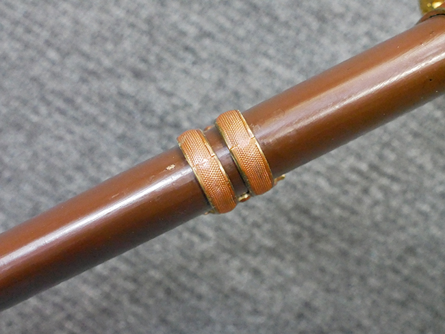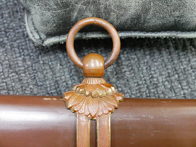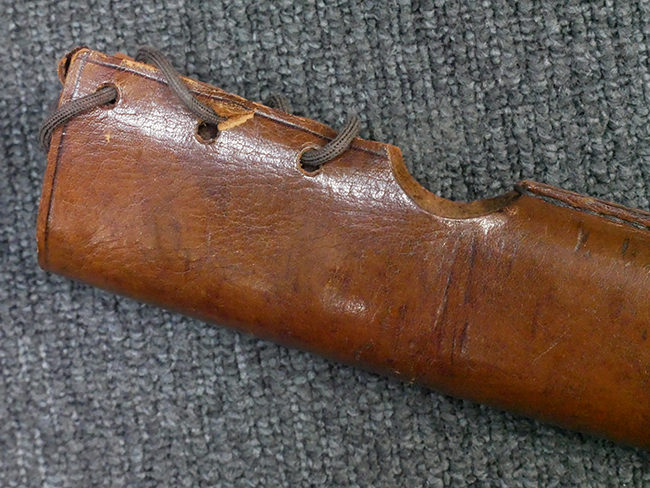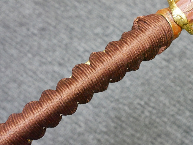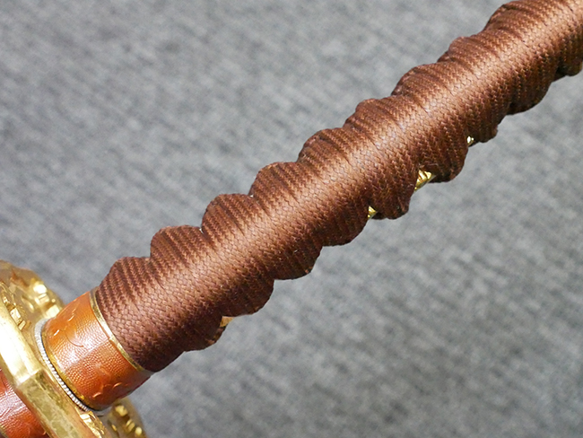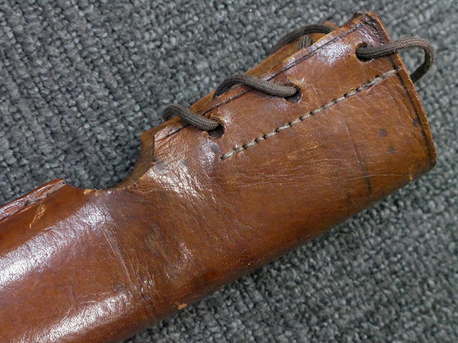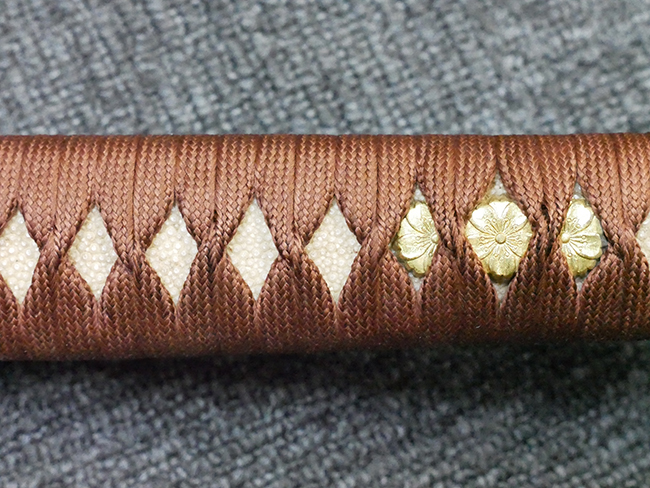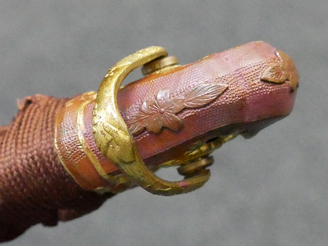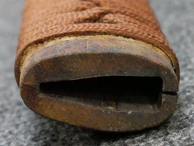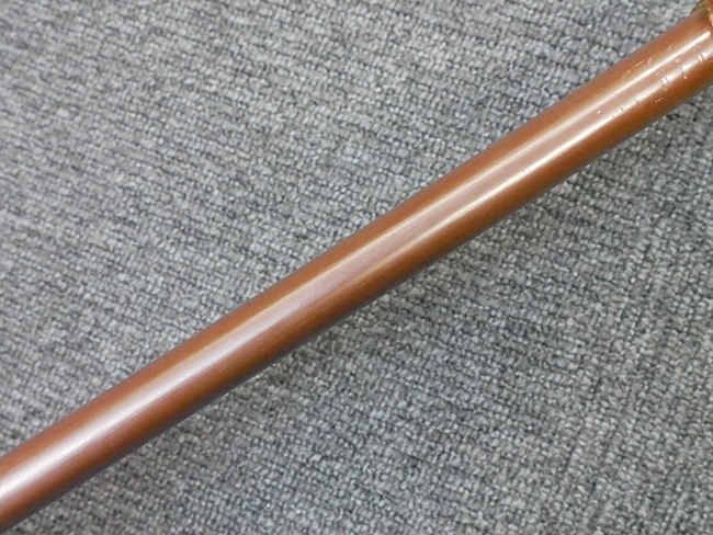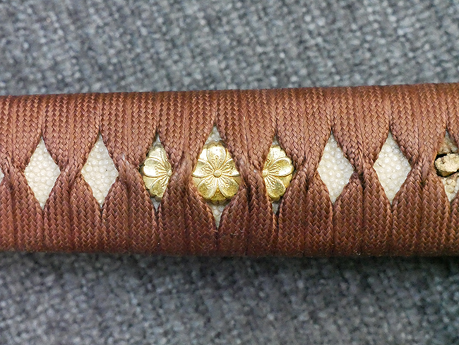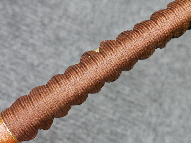 陸軍九八式軍刀の拵えに銃砲刀剣類登録証付の本身(在銘:昭和十九年二月 宗利)が入った品です。 宗利(本名:山上若吉)は新潟県刈羽郡で活動した刀匠で、陸軍軍刀技術奨励会にて会長賞を受賞した刀匠です。 本品の刀身は軍刀として鍛造された現代刀らしく重厚感のある、しっかりとした造りをしています。 古研ぎですが刃切れや刃こぼれは見受けられません。 茎は生く鑢目が施されており、まだら状に黒錆が現れ始めています。 表・裏ともに銘もしっかりと確認できます。 鍔は真鍮(黄銅)製の型打鍔で、「3」の算用数字刻印が入っています。 鍔はややモールドが甘くなっているものの魚子地仕上げが施されており、昭和十九年という時期を考えれば十分に豪華な造りとなっています。 揃いの切羽はアルミ製で前後1枚ずつ、それぞれ算用数字で3の刻印が入っており、縁金具内部にも3の刻印が入っています。 留具は「はばき留め」となっています。 留まり具合はわずかに緩くなっていますが、あまり気にならない程度のもです。 はばきは銅製で鏨による斜め装飾が施されています。 柄は小粒なものの白鮫革が使用されており、柄巻の解れや毛羽立ちといった使用感も殆ども見られず良好な状態が保たれています。 猿手は金属製で、側面には桜花、底面には猿が両手を握った意匠(猿手の語源)が施されています。 猿手は大きな変形もなく動きはスムーズです。 鞘は茶褐色半光沢塗のアルミ製で、略式外装のため外装金具(責金、石突)は当初から装着されていません。 佩鐶は鉄製茶褐色塗装、座金は真鍮製となっています。 野戦用革覆が装着されており、革は柔らかさや艶ともに健在です。 革覆の丸紐終端にはやや解れが見られ、紐を通す穴部分に一箇所断裂が見られるため、着脱には注意が必要です。 外装全長約98.7cm、柄全長約25.4cm。(TK)