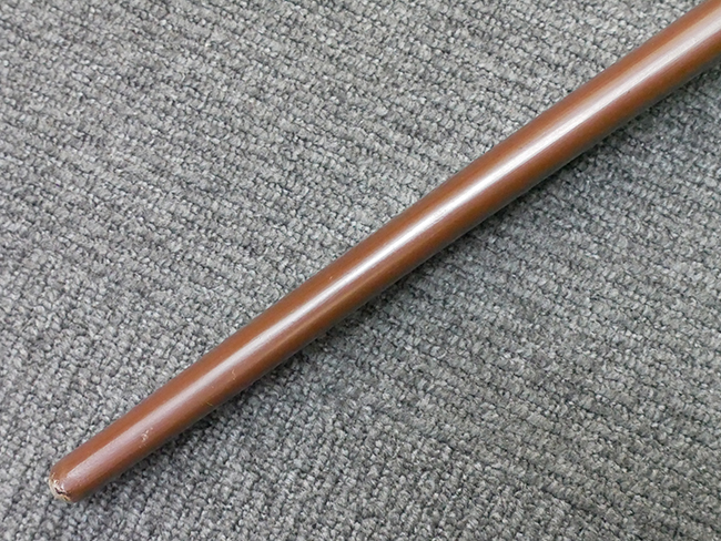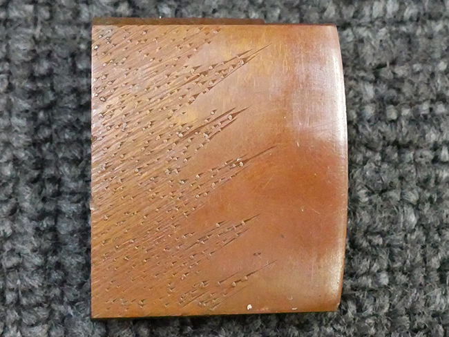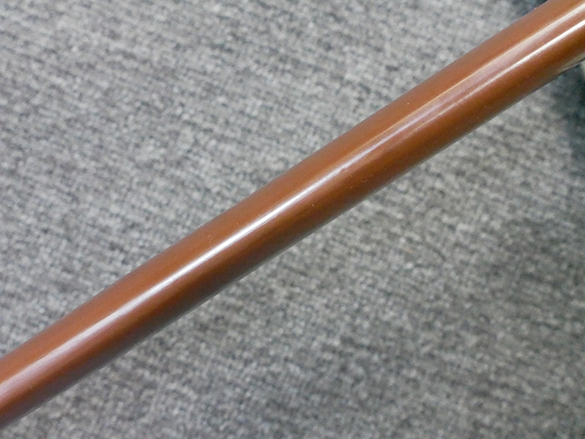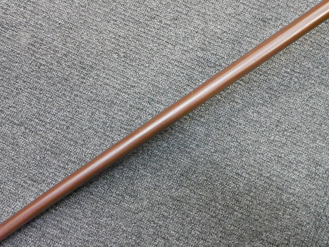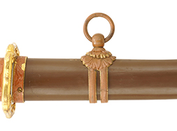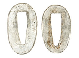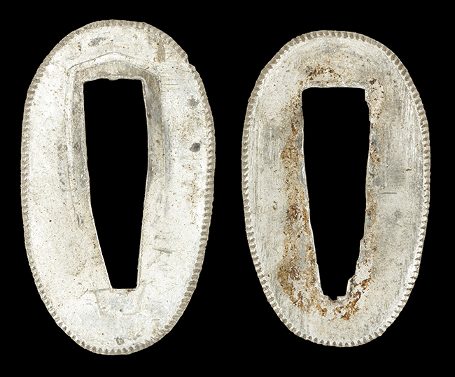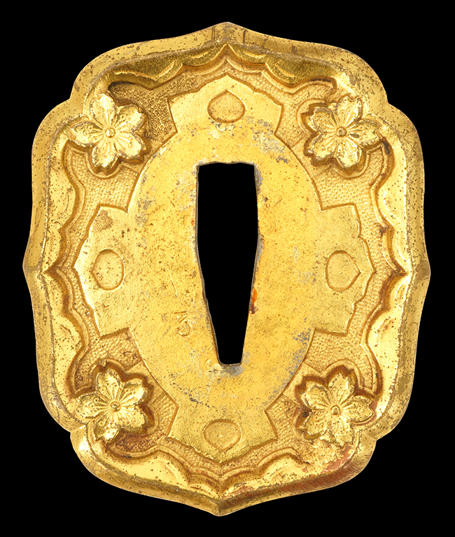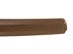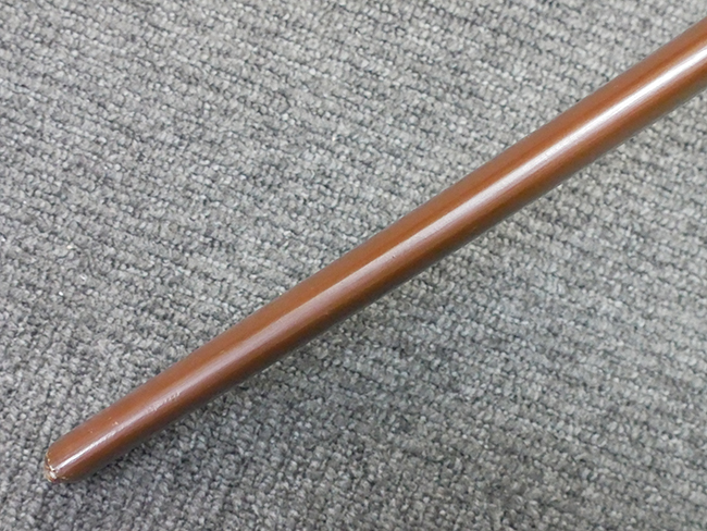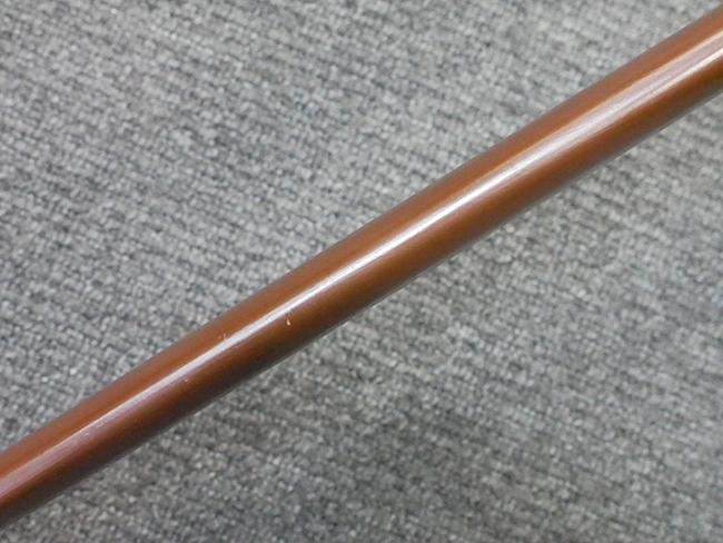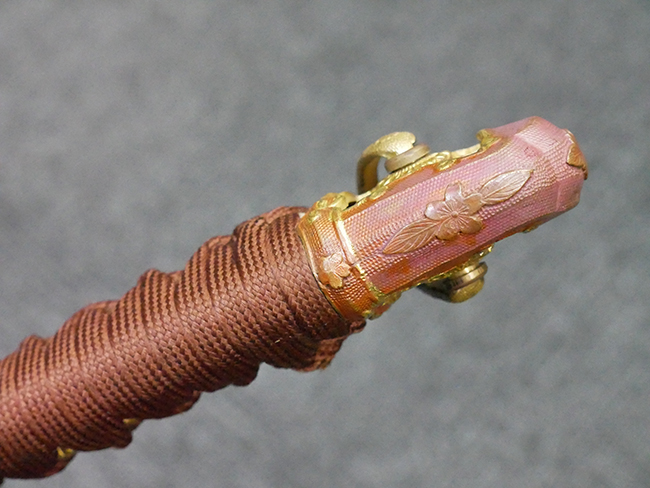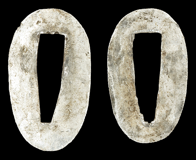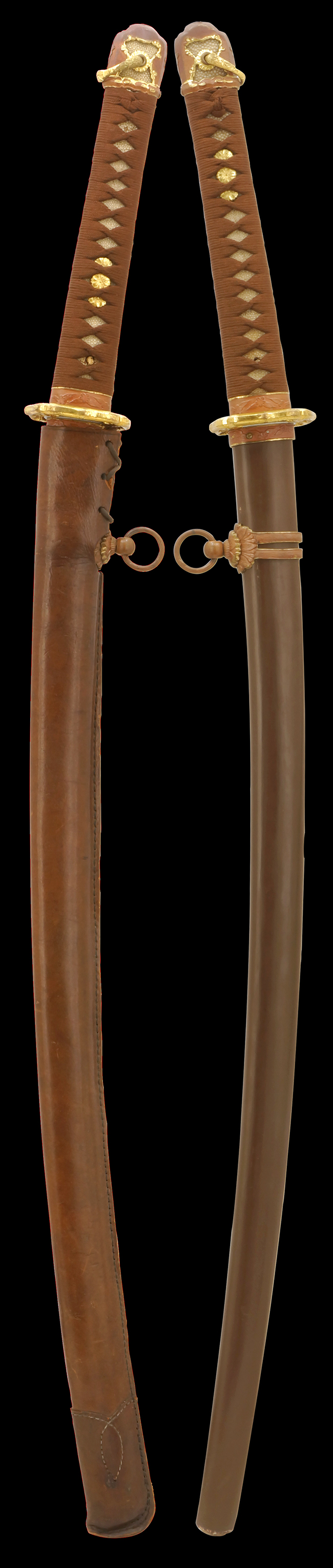 陸軍九八式軍刀の拵えに銃砲刀剣類登録証付の本身(在銘:昭和十九年二月 宗利)が入った品です。 宗利(本名:山上若吉)は新潟県刈羽郡で活動した刀匠で、陸軍軍刀技術奨励会にて会長賞を受賞した刀匠です。 本品の刀身は軍刀として鍛造された現代刀らしく重厚感のある、しっかりとした造りをしています。 古研ぎですが刃切れや刃こぼれは見受けられません。 茎は生く鑢目が施されており、まだら状に黒錆が現れ始めています。 表・裏ともに銘もしっかりと確認できます。 鍔は真鍮(黄銅)製の型打鍔で、「3」の算用数字刻印が入っています。 鍔はややモールドが甘くなっているものの魚子地仕上げが施されており、昭和十九年という時期を考えれば十分に豪華な造りとなっています。 揃いの切羽はアルミ製で前後1枚ずつ、それぞれ算用数字で3の刻印が入っており、縁金具内部にも3の刻印が入っています。 留具は「はばき留め」となっています。 留まり具合はわずかに緩くなっていますが、あまり気にならない程度のもです。 はばきは銅製で鏨による斜め装飾が施されています。 柄は小粒なものの白鮫革が使用されており、柄巻の解れや毛羽立ちといった使用感も殆ども見られず良好な状態が保たれています。 猿手は金属製で、側面には桜花、底面には猿が両手を握った意匠(猿手の語源)が施されています。 猿手は大きな変形もなく動きはスムーズです。 鞘は茶褐色半光沢塗のアルミ製で、略式外装のため外装金具(責金、石突)は当初から装着されていません。 佩鐶は鉄製茶褐色塗装、座金は真鍮製となっています。 野戦用革覆が装着されており、革は柔らかさや艶ともに健在です。 革覆の丸紐終端にはやや解れが見られ、紐を通す穴部分に一箇所断裂が見られるため、着脱には注意が必要です。 外装全長約98.7cm、柄全長約25.4cm。(TK)