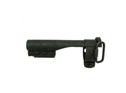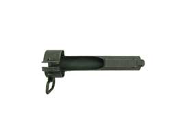 M1 カービンの着剣装置付フロント・バンド・アッセンブリーです。このタイプのフロントバンドは1944年5月から工場だけでなく前線(デポ)でも付け替えが行なわれているとのですが記録写真では見当たらず、かろうじて沖縄戦の写真に見られるくらいです。取り付けられる銃剣はM4銃剣でM3トレンチナイフとよく似たタイプのグリップ部分が革製のもです。
