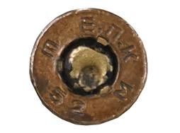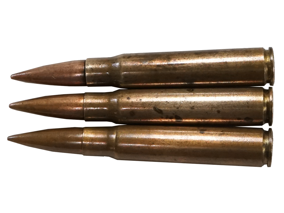 真鍮製の薬莢にスティールコアのFMJ弾がシーティングされています。 ギリシャ文字のヘッドスタンプが打刻されており、雷管に打撃痕があり装薬等の入っていない安全品です。 どの個体にも経年によるくすみが見られ、個体後に若干コンディションが異なります。 (YS)
