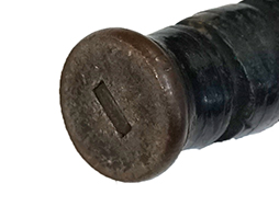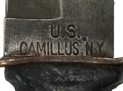 剣身の根元には「U.S. CAMILLUS N.Y.」の刻印が見受けられます。 刀身の仕上げが落ちてやや地金っぽくなっており、表面錆が見られます。 ガード部分やグリップ底部も仕上げが落ちてやや錆が散見されます。 グリップはやや小傷が見られますが、大きな破損は見られません。 シースのベルト・ループ裏面にやや表面仕上げの剥落が見られ、全体に皺が見られますが、生地の柔らかさが保たれており、大きな破損は見られません。 シースには「21」のステンシル文字が見られます。 全体的に適度な使用感があり、金属部や革に錆や小傷、経年感が見受けられるものの、目立った破損などはありません。 (TM)(TK)- 詳細画像