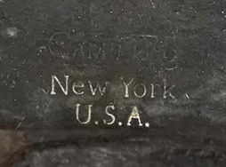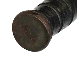 剣身の根本部分にはやや薄くなっていますが、「Camillus New York U.S.A.」の刻印が見受けられます。 刀身はパーカー仕上げで、若干の油染みや錆が見られます。 革製シースには若干の小傷や皺が見られますが、艶や柔らかさを保った状態です。 全体的に適度な使用感があり、鍔などの金属部や革の一部に錆や小傷が見受けられるものの、目立った破損は見られません。 (TM)(TK)- 詳細画像