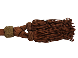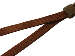昭和12年に制定された太刀型軍刀と合わせて制式化された、平織づくりのの刀緒です。形や見た目は陸軍の昭和9年制式の刀緒とほぼ変わりがありませんが、階級別の色の差異はなく表裏共に茶色一色となっています。