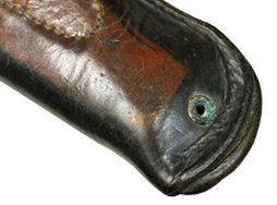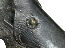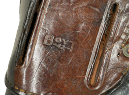 米軍が1916年に採用したM1916ホルスター (BOYT製)です。 ホルスター裏面のベルト・ループ付近に「BOYT 42」の文字が見られます。 本体は背面の一部を除いて黒染め仕上げとなっており、革の表面には経年による擦れや皺が見られますが、現状強度的な影響は見られません。 革生地はやや硬化がみられます。 レッグ・ストラップを通すアイレット金具にはやや腐食が見られます。 (MD)(TK)