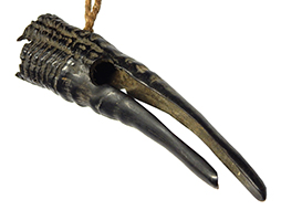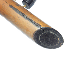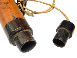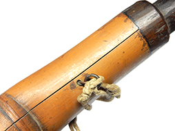江戸時代に造られたと思われる竹製の火薬入れです。 本体の直径は約3cm、全長は約25cmの長めのもので、木製の蓋が紐で繋がっています。 加工が施された水牛の角(全長約9.5cm)と思しき緒締付きです。
