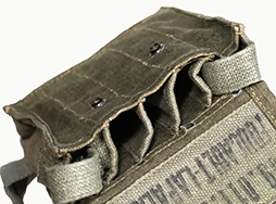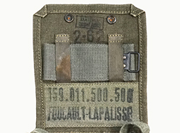 - アイテム説明TAP 50/53ピストル・ベルトに対応したMAT49 マガジン・パウチです。 フラップの裏面には一部不鮮明ながら「2-62 159.011.500.500 FOUCAULT-LAPALISSER」のスタンプが押印されています。 フラップ内側に収納されているストラップと組み合わせることで、パウチを肩から提げることも可能です。 キャンバス地には素材特有の解れや毛羽立ちが見られますが、破れなどの大きな破損は見られません。 フラップ内部のストラップをとめるループ部にやや染みが見られます。 スナップ・ボタンや金具には僅かに緑青が見られますが、こちらも機能的な問題は見られません。 全体的に各部縫製や金具の取り付けもしっかりとした状態です。 (TK)