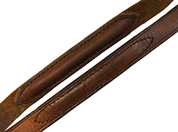 MG42 スリング (MG34共用、革製)です。 適度な経年感および若干のひび割れ、使用感が見られるものの、大きな破損はなく革もしなやかさを保っており、全体的に装着に問題のない状態が保たれています。 金具の作動にも問題ありません。 金具、革部分ともに刻印は見られません。 他のMG42スリングよりも明るい茶色の生地になっています。 とはいえスリング断面(コバ面)の処理や各金具はしっかりとした造りです。 個体により若干状態が異なります。 (TM)(TK)