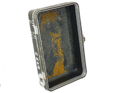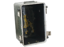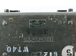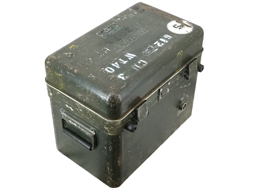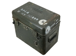 - アイテム説明米軍の光学機器コンテナです。 蓋上面の銘板はかなり剥落により判読しずらくなっていますが、「CONFIDENTIAL(機密)」「NATIONAL SECURITY AGENCY(アメリカ国家安全保障局)」や「CASE CARRYING STOCK No. NSN(数桁未詳)5810273(8?)6(0?)6」「INSIDE DIMENS(以下未詳)」「16 1/2x10x14 CR352(以下未詳)」などと読める文字が確認できます。 本体には「001814」のシリアルNo.刻印が見られ、蓋上面と本体底面には「U.S.PROPERTY」のモールドが見られます。 その他ステンシルの番号が各所に入っています。 側面には内部気圧調整用のバルブがあり、「OPEN BEFORE AIR FRIGHT」と書かれています。 内部にはスポンジ状のクッションを剥がした跡があり、ケース形状と併せると車輛用ナイトビジョンやサーマルビジョンといった大型光学機器の運搬に使用されたものと思われます。 ケースには打ち傷や線傷が見られますが、大きな凹みはありません。 蓋のロックにはE.C.Sの社名刻印が入っています。 各ロック金具も機能しており、蓋の開閉やロックに問題はありません。 (TK)