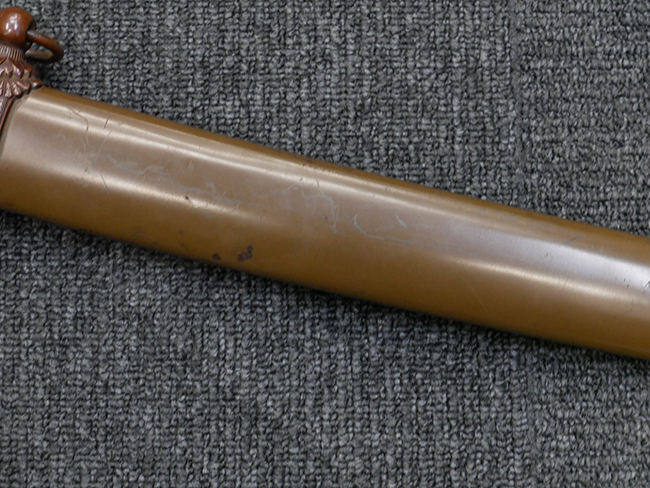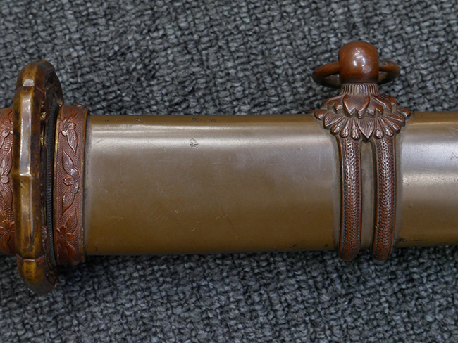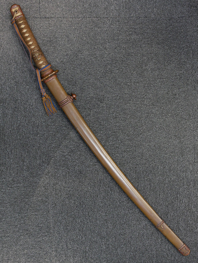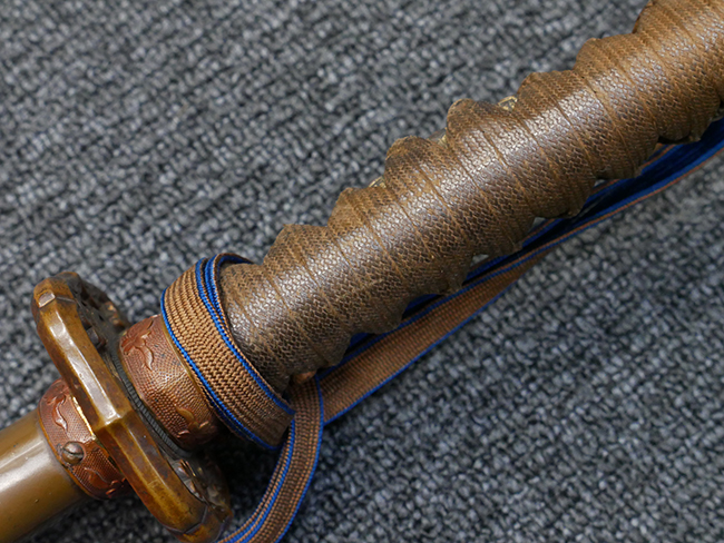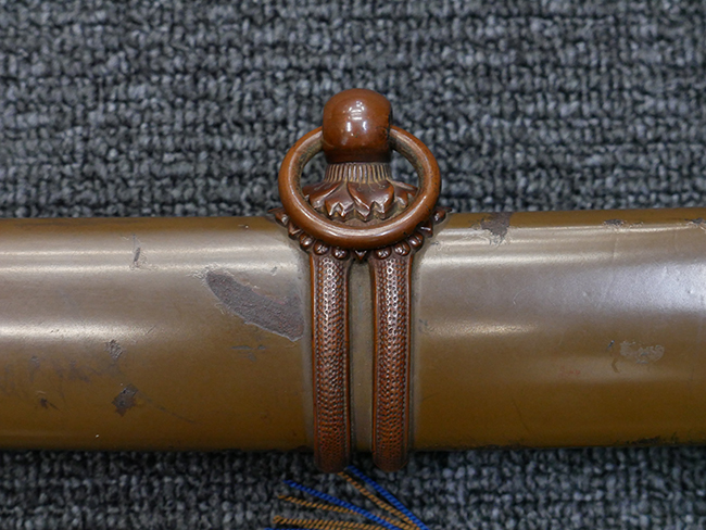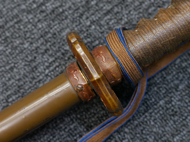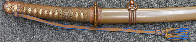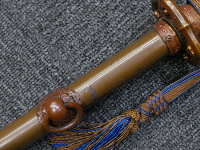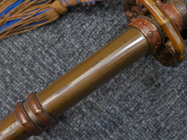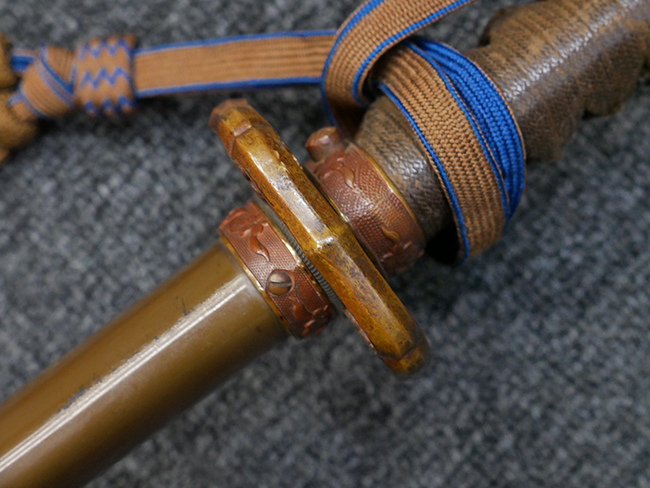 鉄製鞘は国防色半光沢塗で、擦れや一部に塗装の剥がれがあり錆がでていますが、大きな凹みや打ち傷は見られません。 外装金物には若干の使用感はありますが茶褐色塗装も良く残っています。 付属の尉官刀緒は刀緒両端を裏面の青糸で縁取った上等品が取り付けられています。 房部分も健在で、青糸の発色も鮮やかに残っています。各部構成に高級感のある拵となっています。
