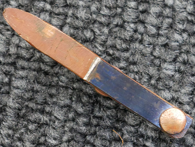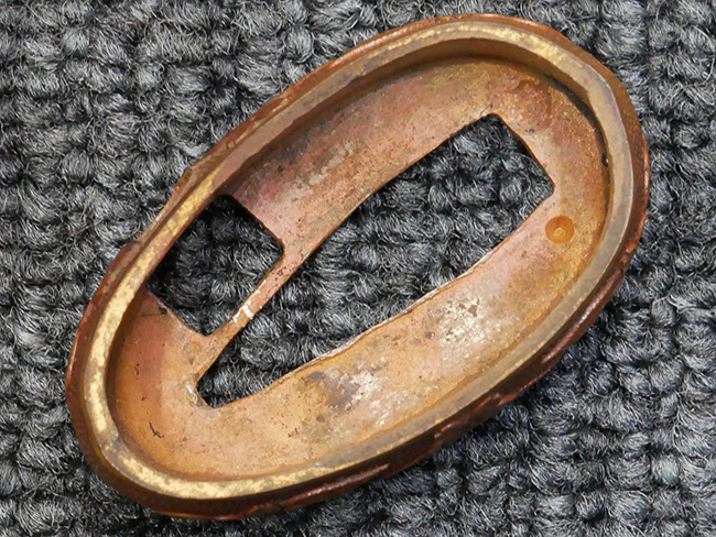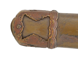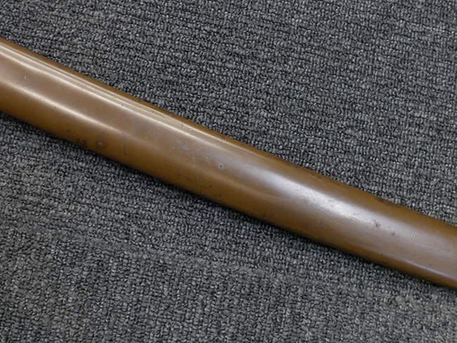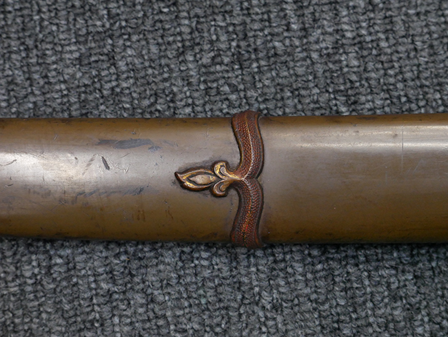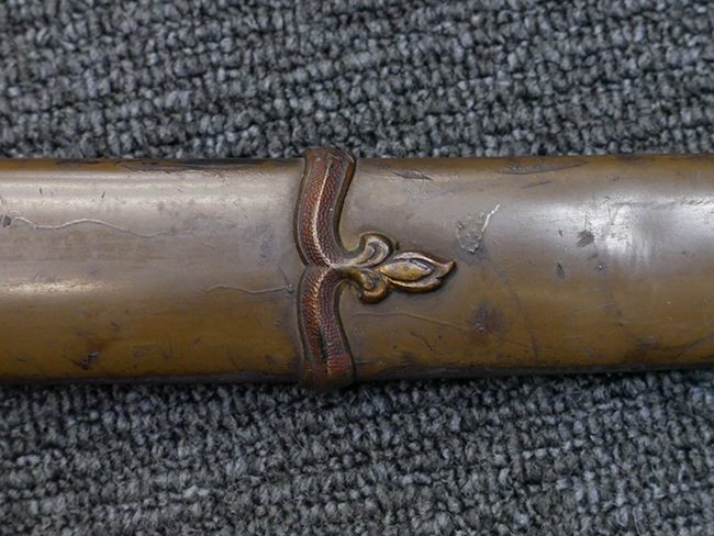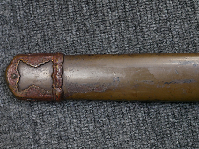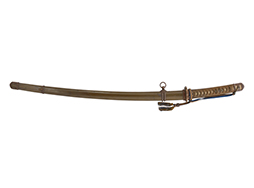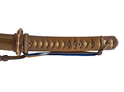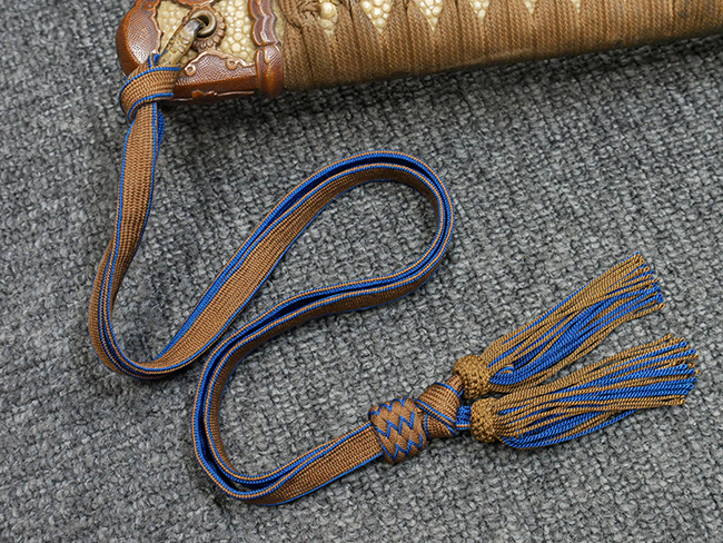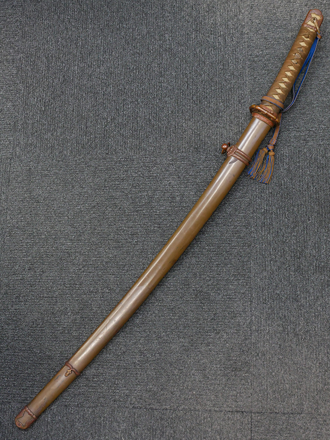 鉄製鞘は国防色半光沢塗で、擦れや一部に塗装の剥がれがあり錆がでていますが、大きな凹みや打ち傷は見られません。 外装金物には若干の使用感はありますが茶褐色塗装も良く残っています。 付属の尉官刀緒は刀緒両端を裏面の青糸で縁取った上等品が取り付けられています。 房部分も健在で、青糸の発色も鮮やかに残っています。各部構成に高級感のある拵となっています。